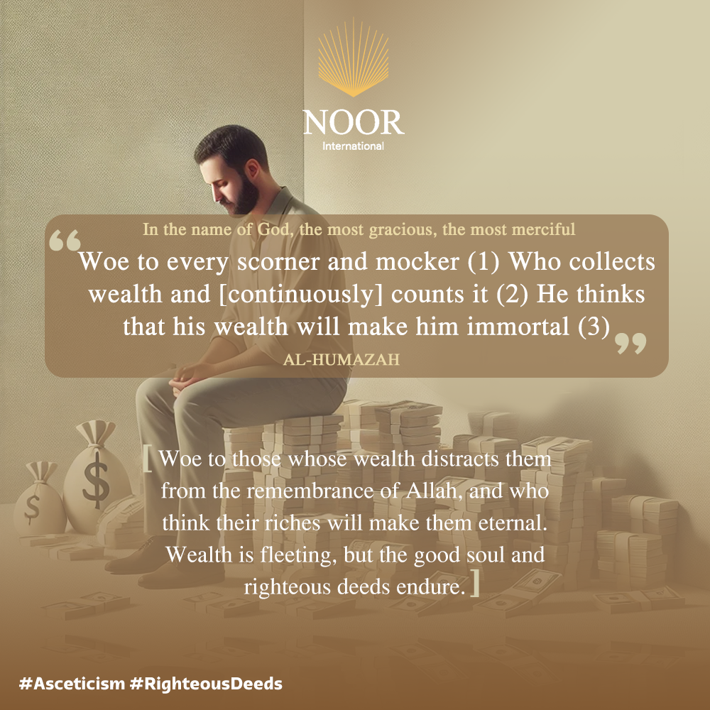 "Woe to those whose wealth distracts them from the remembrance of Allah, and who think their riches will make them eternal. Wealth is fleeting, but the good soul and righteous deeds endure." #Asceticism #RighteousDeeds