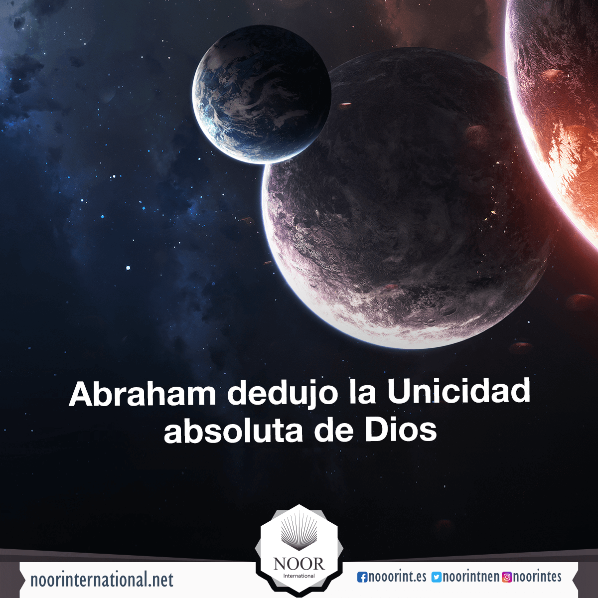 {Y así mostramos a Abraham los reinos de los cielos y de la tierra para que fuera de quienes creen con convicción. Y cuando la noche lo cubrió con su oscuridad, vio una estrella y dijo: “Esto es mi Señor”. Mas, cuando desapareció, dijo: “No amo lo que se desvanece”. Y cuando vio aparecer la luna, dijo: “Este es mi Señor”. Mas, cuando se ocultó, dijo: “Si mi Señor no me guía, seré de los extraviados”. Y cuando vio salir el sol, dijo: “Esto es mi Señor, es más grande (que todo lo demás)”. Mas, cuando se puso, dijo: “¡Pueblo mío!, no tengo nada que ver con lo que ustedes adoran. Consagro mi adoración pura y sincera a Quien ha creado los cielos y la tierra; y no soy de los idólatras”}