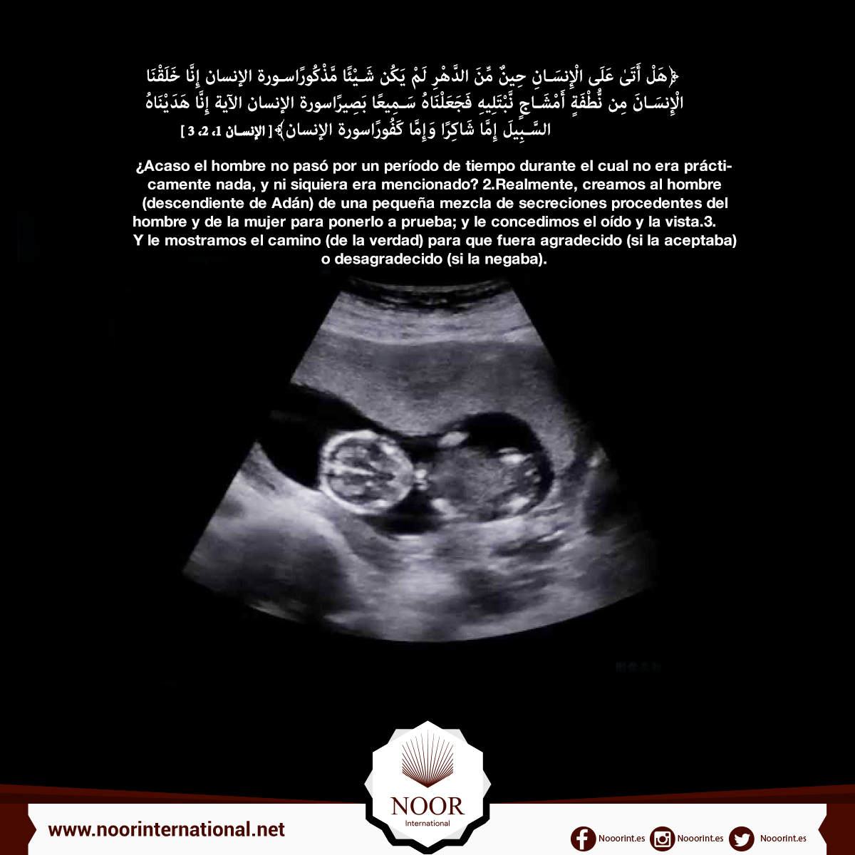 ¿Acaso el hombre no pasó por un período de tiempo durante el cual no era prácticamente nada, y ni siquiera era mencionado? Realmente, creamos al hombre (descendiente de Adán) de una pequeña mezcla de secreciones procedentes del hombre y de la mujer para ponerlo a prueba; y le concedimos el oído y la vista. Y le mostramos el camino (de la verdad) para que fuera agradecido (si la aceptaba) o desagradecido (si la negaba).