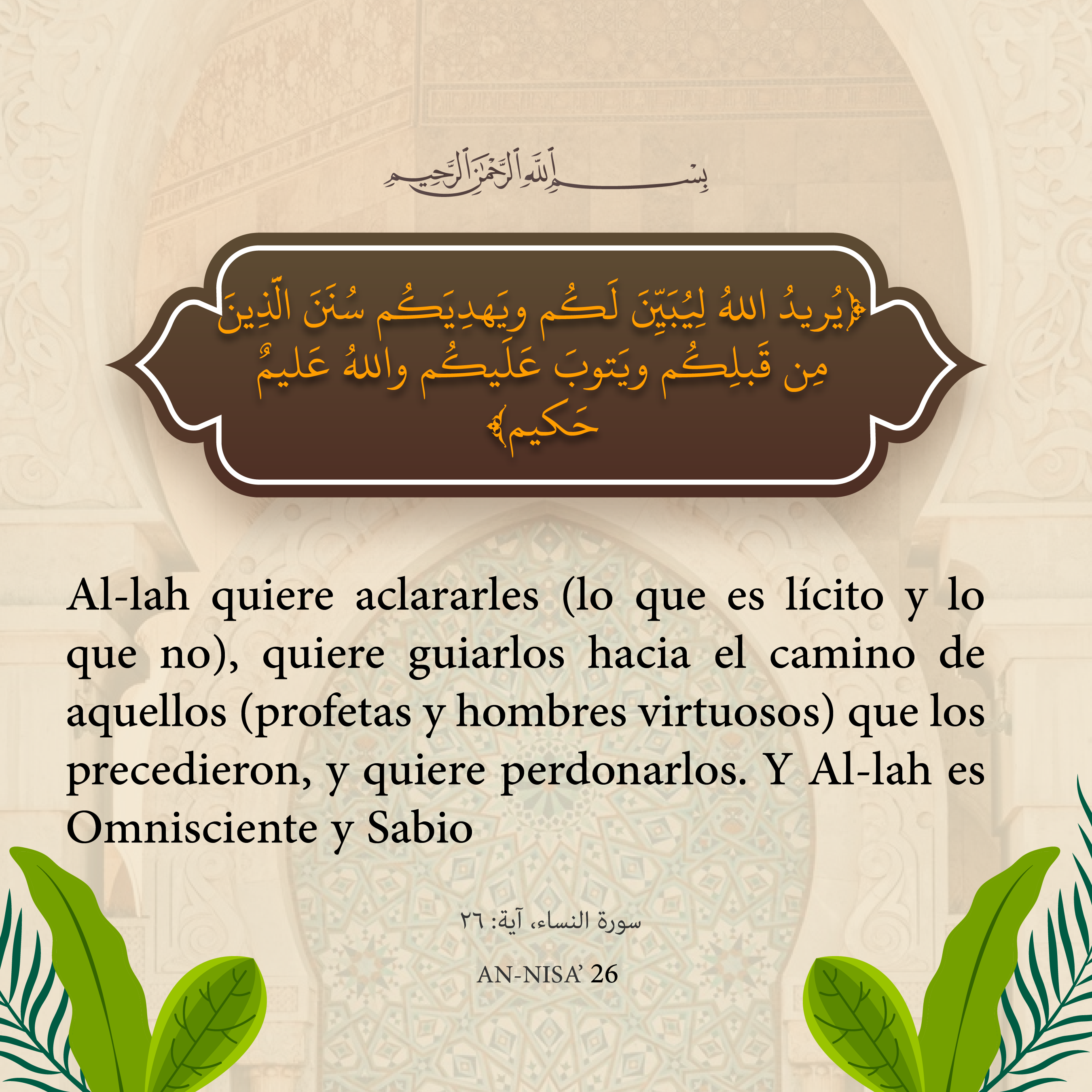 Al-lah quiere aclararos (lo que es lícito y lo que no), quiere guiaros hacia el camino de aquellos (profetas y hombres virtuosos) que os precedieron, y quiere perdonaros. Y Al-lah es Omnisciente y Sabio.