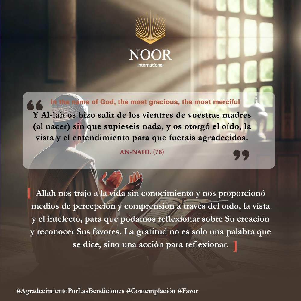 Allah nos trajo a la vida sin conocimiento y nos proporcionó medios de percepción y comprensión a través del oído, la vista y el intelecto, para que podamos reflexionar sobre Su creación y reconocer Sus favores. La gratitud no es solo una palabra que se dice, sino una acción para reflexionar. #AgradecimientoPorLasBendiciones #Contemplación #Favor