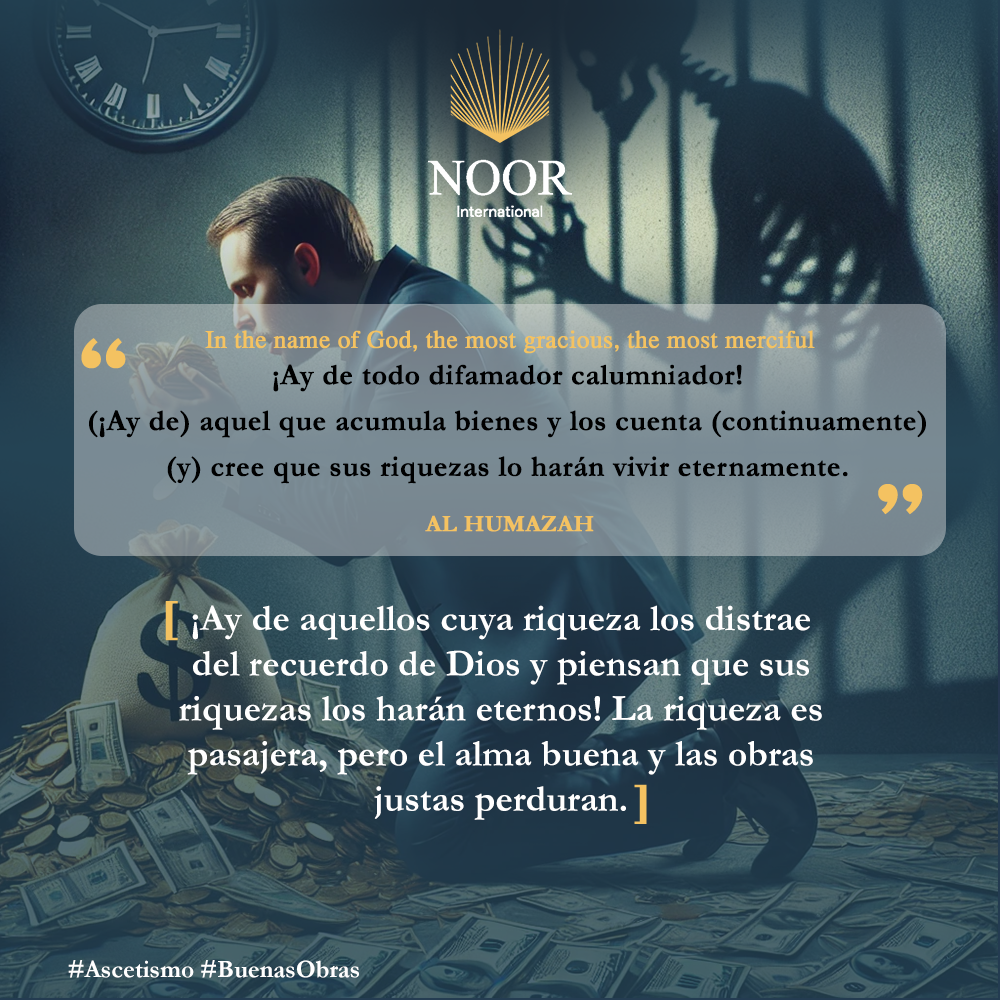 "¡Ay de aquellos cuya riqueza los distrae del recuerdo de Dios y piensan que sus riquezas los harán eternos! La riqueza es pasajera, pero el alma buena y las obras justas perduran." #Ascetismo #BuenasObras