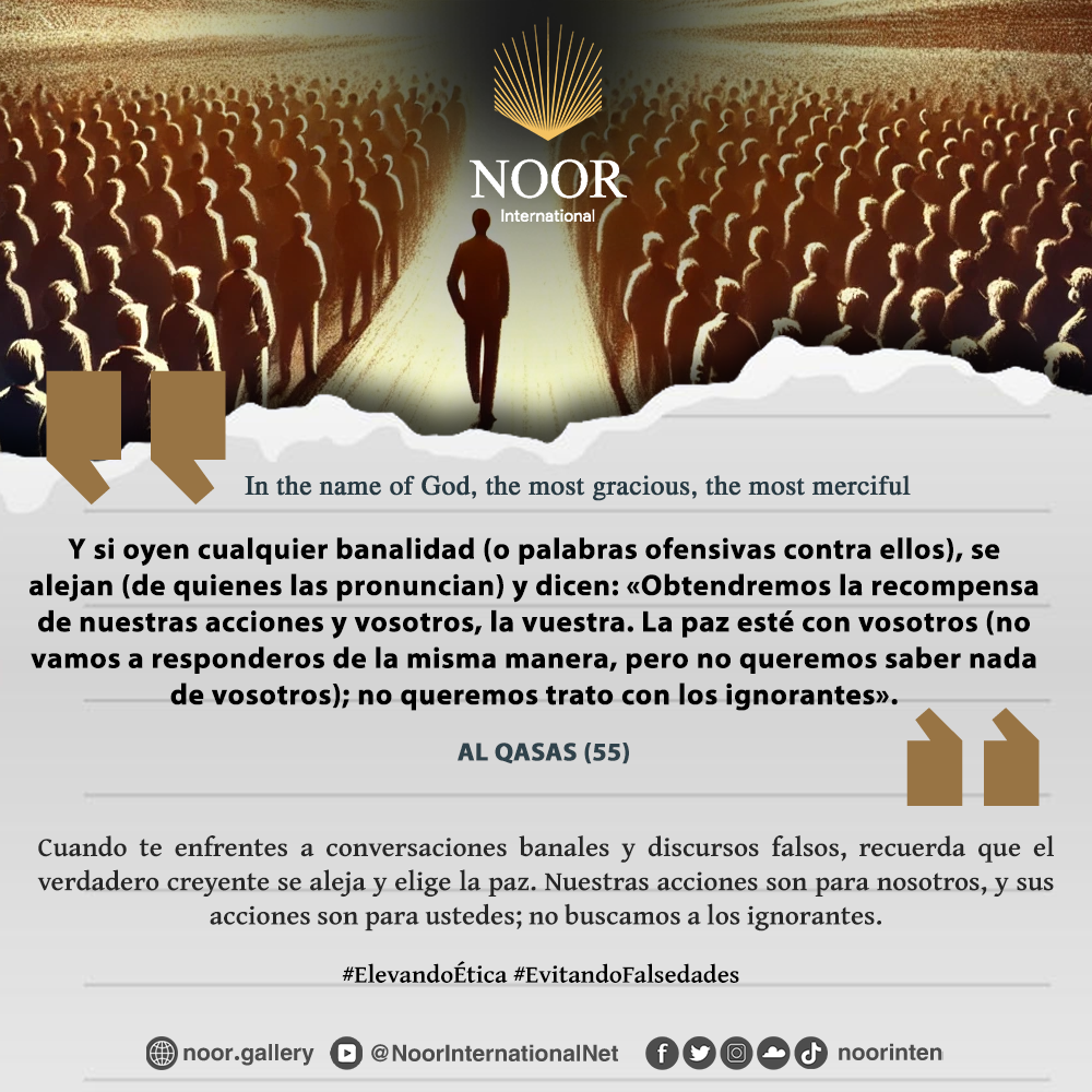 "Cuando te enfrentes a conversaciones banales y discursos falsos, recuerda que el verdadero creyente se aleja y elige la paz. Nuestras acciones son para nosotros, y sus acciones son para ustedes; no buscamos a los ignorantes." #ElevandoÉtica