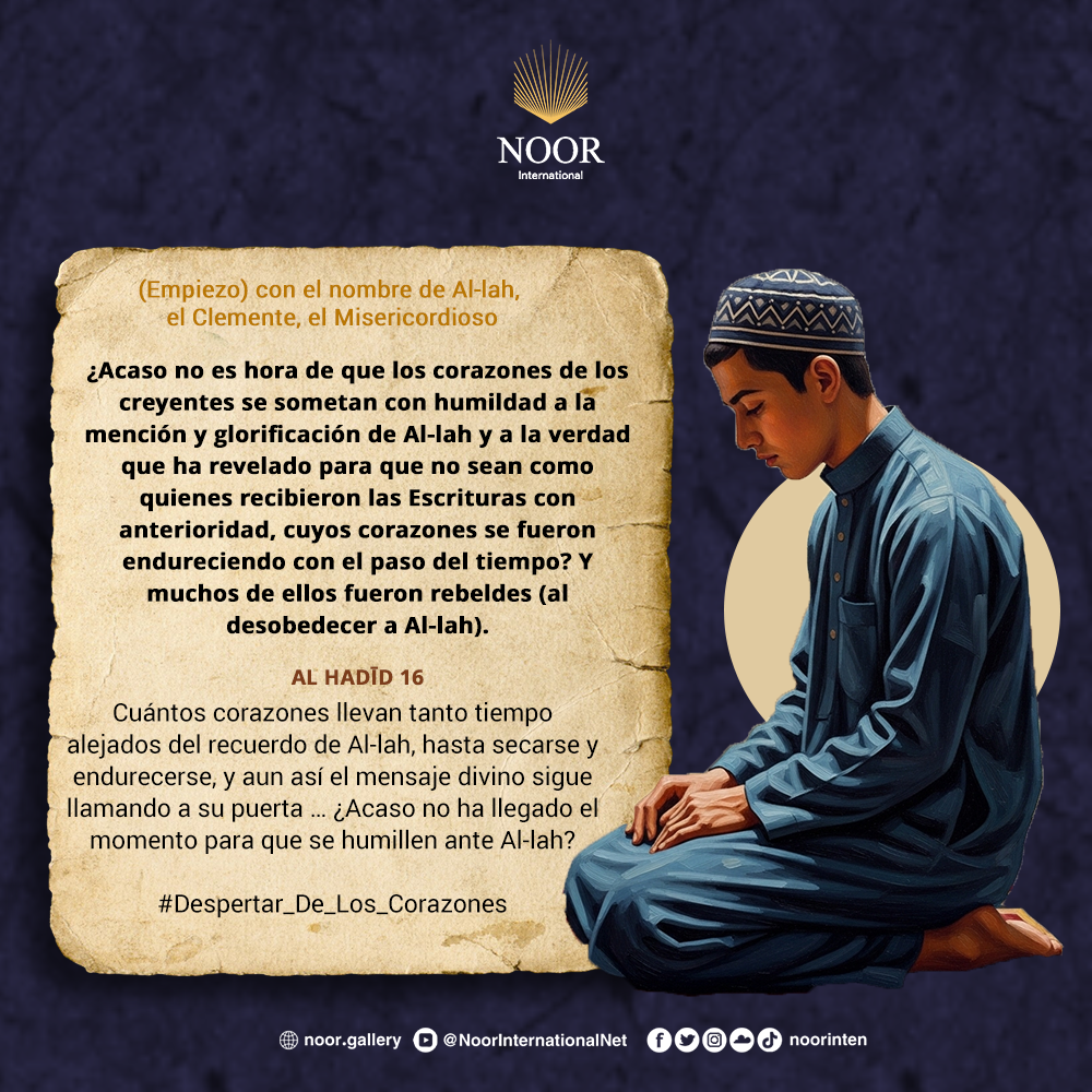 Cuántos corazones llevan tanto tiempo alejados del recuerdo de Al-lah, hasta secarse y endurecerse, y aun así el mensaje divino sigue llamando a su puerta … ¿Acaso no ha llegado el momento para que se humillen ante Al-lah?