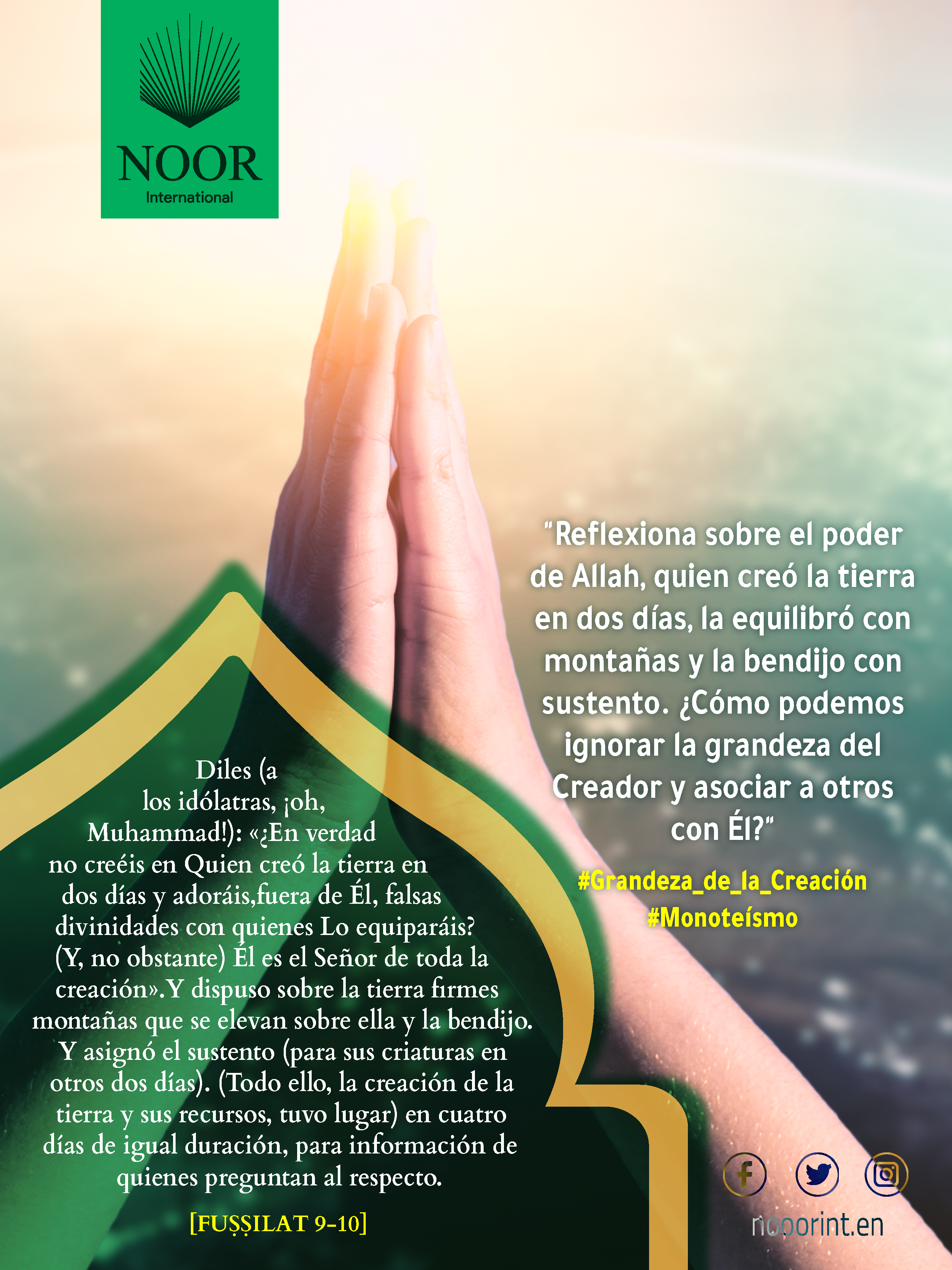 "Reflexiona sobre el poder de Allah, quien creó la tierra en dos días, la equilibró con montañas y la bendijo con sustento. ¿Cómo podemos ignorar la grandeza del Creador y asociar a otros con Él?" #Grandeza_de_la_Creación #Monoteísmo
