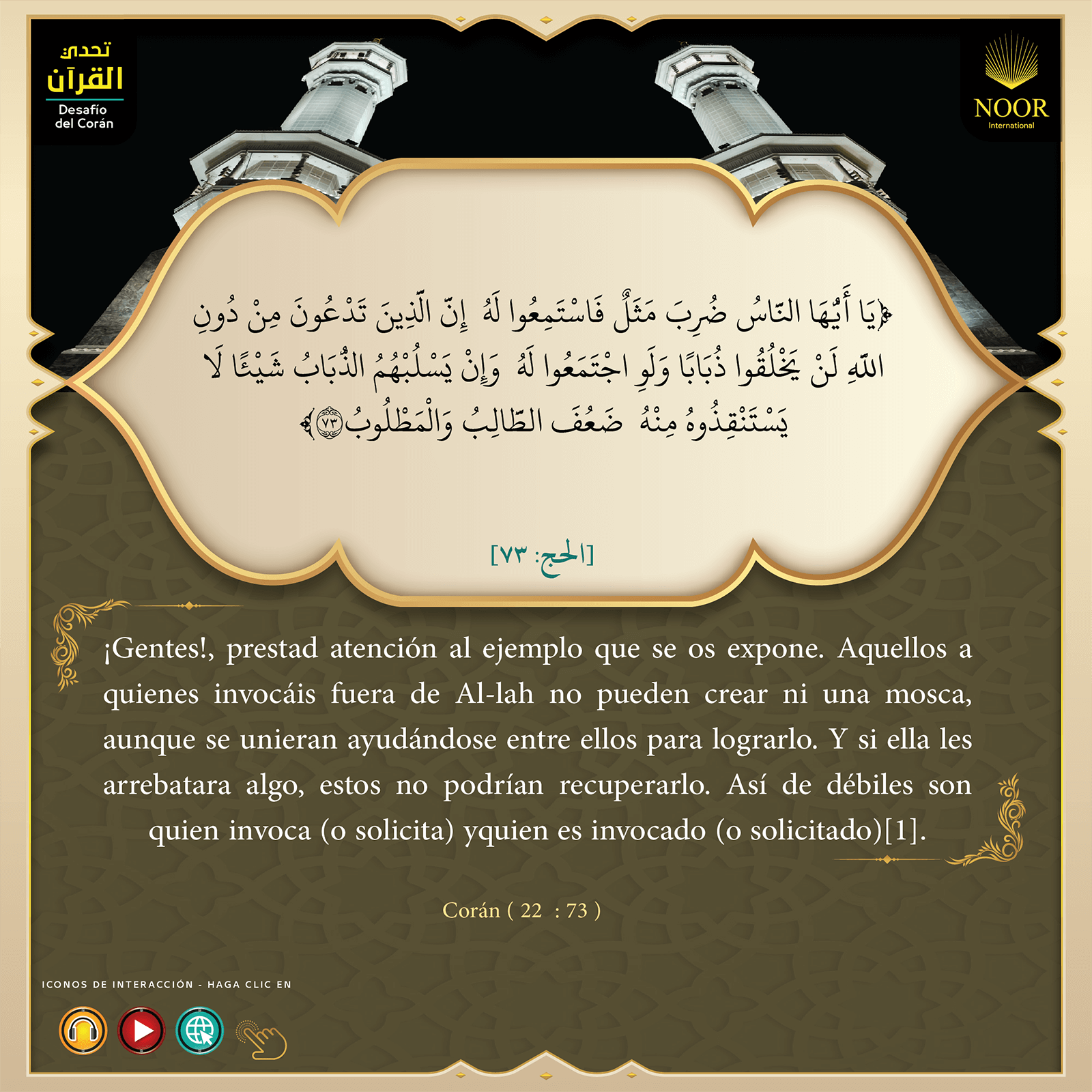 ¡Gentes!, prestad atención al ejemplo que se os expone. Aquellos a quienes invocáis fuera de Al-lah no pueden crear ni una mosca, aunque se unieran ayudándose entre ellos para lograrlo. Y si ella les arrebatara algo, estos no podrían recuperarlo. Así de débiles son quien invoca (o solicita) yquien es invocado (o solicitado)[1].