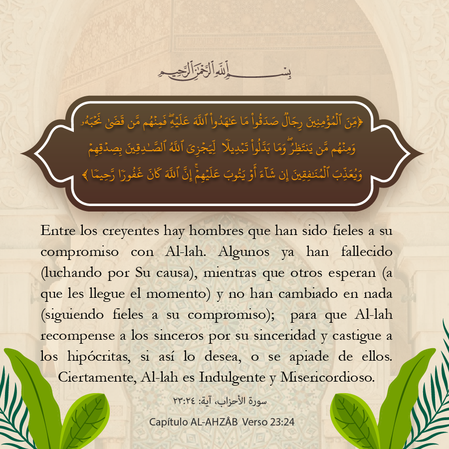 Entre los creyentes hay hombres que han sido fieles a su compromiso con Al-lah. Algunos ya han fallecido (luchando por Su causa), mientras que otros esperan (a que les llegue el momento) y no han cambiado en nada (siguiendo fieles a su compromiso);(23)para que Al-lah recompense a los sinceros por su sinceridad y castigue a los hipócritas, si así lo desea, o se apiade de ellos. Ciertamente, Al-lah es Indulgente y Misericordioso.