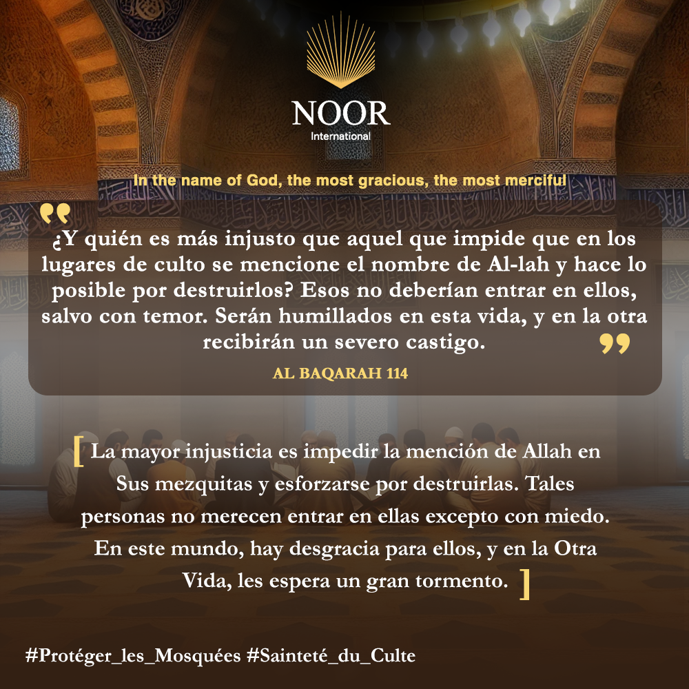 La mayor injusticia es impedir la mención de Allah en Sus mezquitas y esforzarse por destruirlas. Tales personas no merecen entrar en ellas excepto con miedo. En este mundo, hay desgracia para ellos, y en la Otra Vida, les espera un gran tormento. #Proteger_Las_Mezquitas