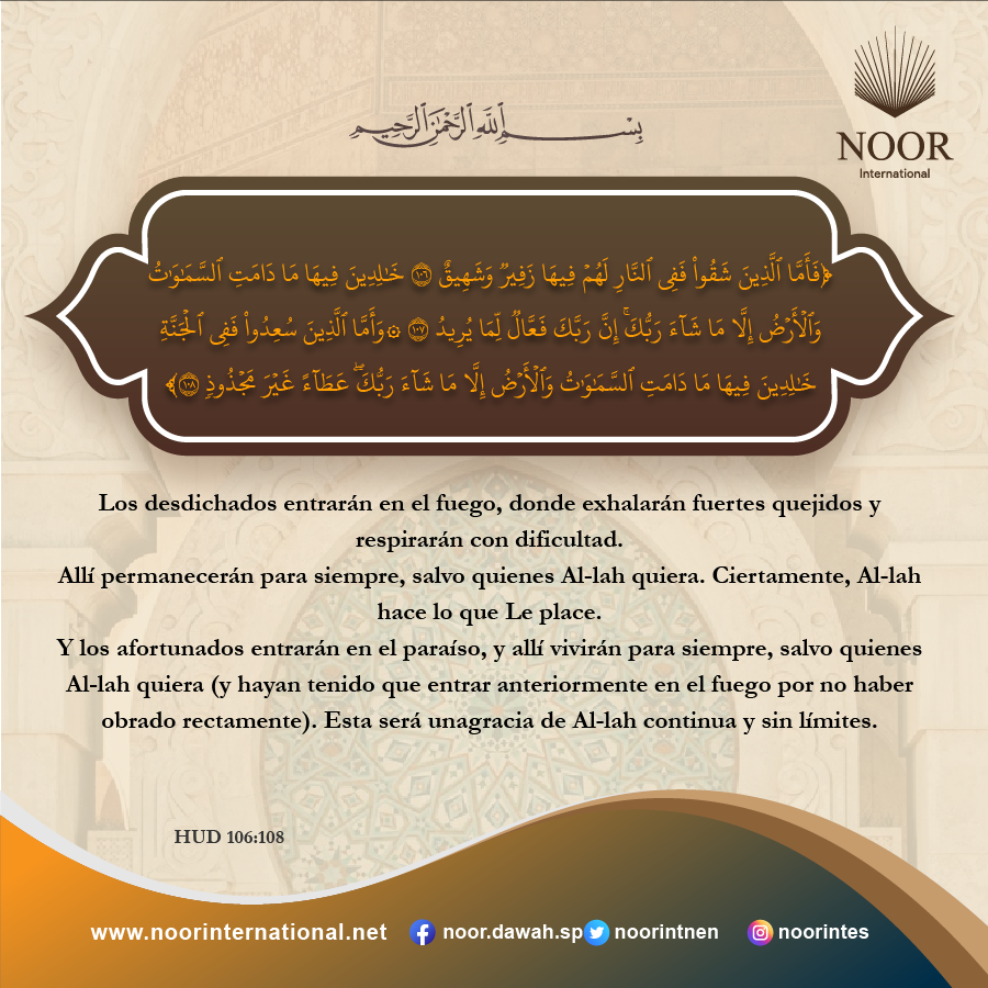 Y los afortunados entrarán en el paraíso, y allí vivirán para siempre, salvo quienes Al-lah quiera[1] (y hayan tenido que entrar anteriormente en el fuego por no haber obrado rectamente). Esta será unagracia de Al-lah continua y sin límites.