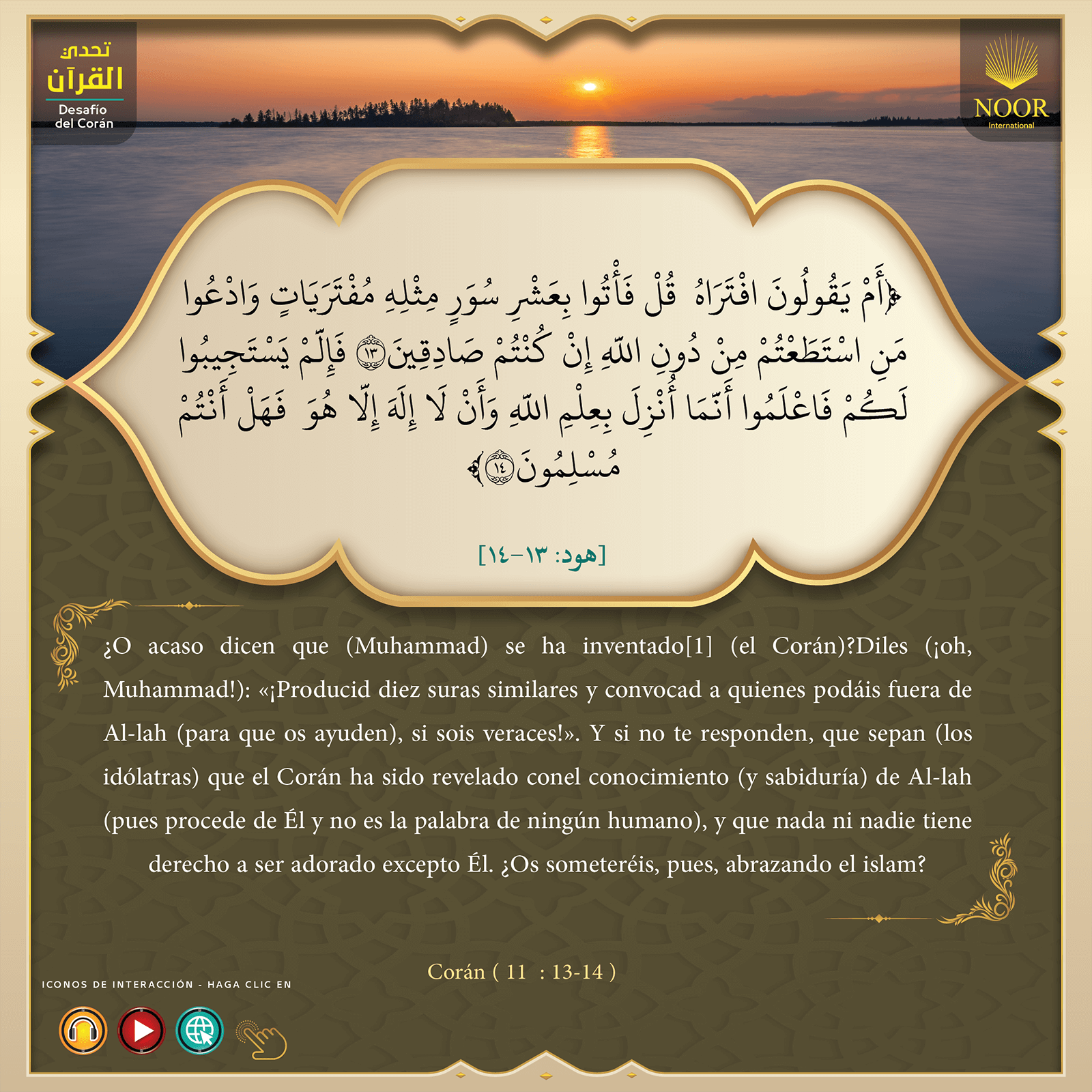 ¿O acaso dicen que (Muhammad) se ha inventado[1] (el Corán)?Diles (¡oh, Muhammad!): «¡Producid diez suras similares y convocad a quienes podáis fuera de Al-lah (para que os ayuden), si sois veraces!». Y si no te responden, que sepan (los idólatras) que el Corán ha sido revelado conel conocimiento (y sabiduría) de Al-lah (pues procede de Él y no es la palabra de ningún humano), y que nada ni nadie tiene derecho a ser adorado excepto Él. ¿Os someteréis, pues, abrazando el islam?