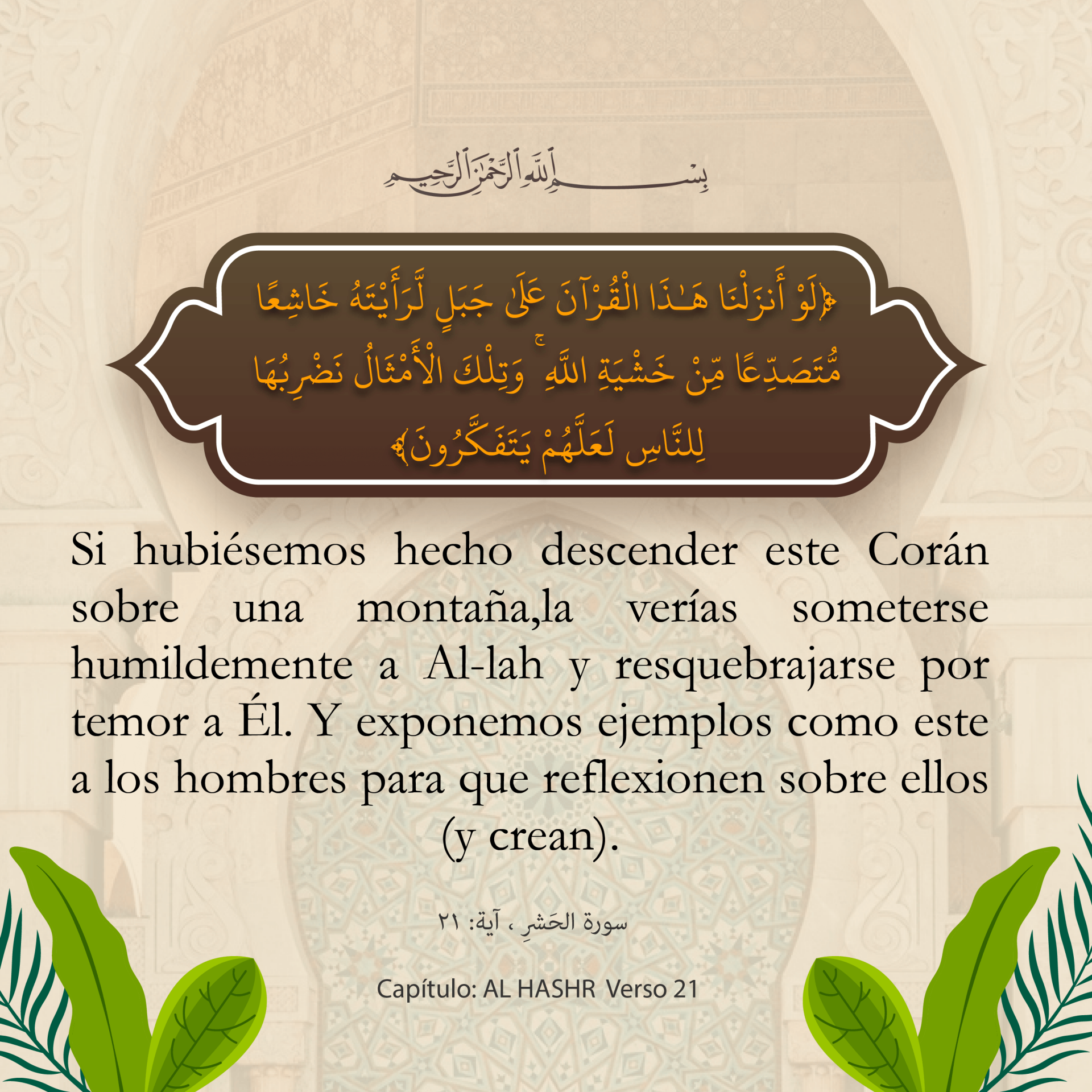 Si hubiésemos hecho descender este Corán sobre una montaña,la verías someterse humildemente a Al-lah y resquebrajarse por temor a Él. Y exponemos ejemplos como este a los hombres para que reflexionen sobre ellos (y crean)[1].
