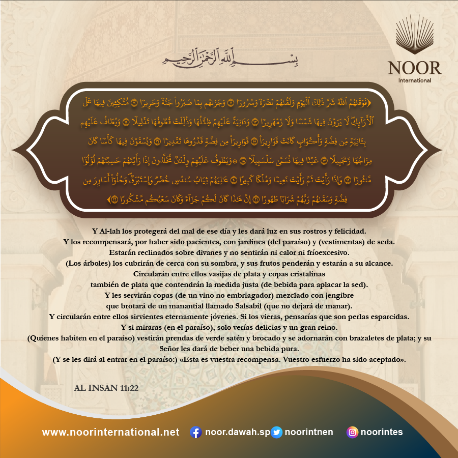 Pero Allah los protegió del mal de ese Día y les concedió resplandor y alegría.(12). Y los recompensó por su paciencia con un Jardín y vestiduras de seda.(13). Reposarán en él sobre lechos elevados, sin ver allí ni sol ni frío helado.(14). La sombra estará cerca sobre ellos, y los frutos colgarán bajos a su alcance.(15). Se les servirán recipientes de plata y copas transparentes,(16). De plata, perfectamente medidas.(17). Y beberán allí una copa cuyo aroma será de jengibre,(18). De un manantial llamado Salsabil.(19). Y circularán entre ellos jóvenes eternamente jóvenes; cuando los veas, pensarás que son perlas esparcidas.(20). Y cuando mires allí, verás un deleite y un reino grandioso.(21). Estarán vestidos con ropas de seda verde fina y brocado, adornados con brazaletes de plata, y su Señor les dará de beber una bebida pura.(22). “En verdad, esta es vuestra recompensa, y vuestro esfuerzo ha sido agradecido.”
