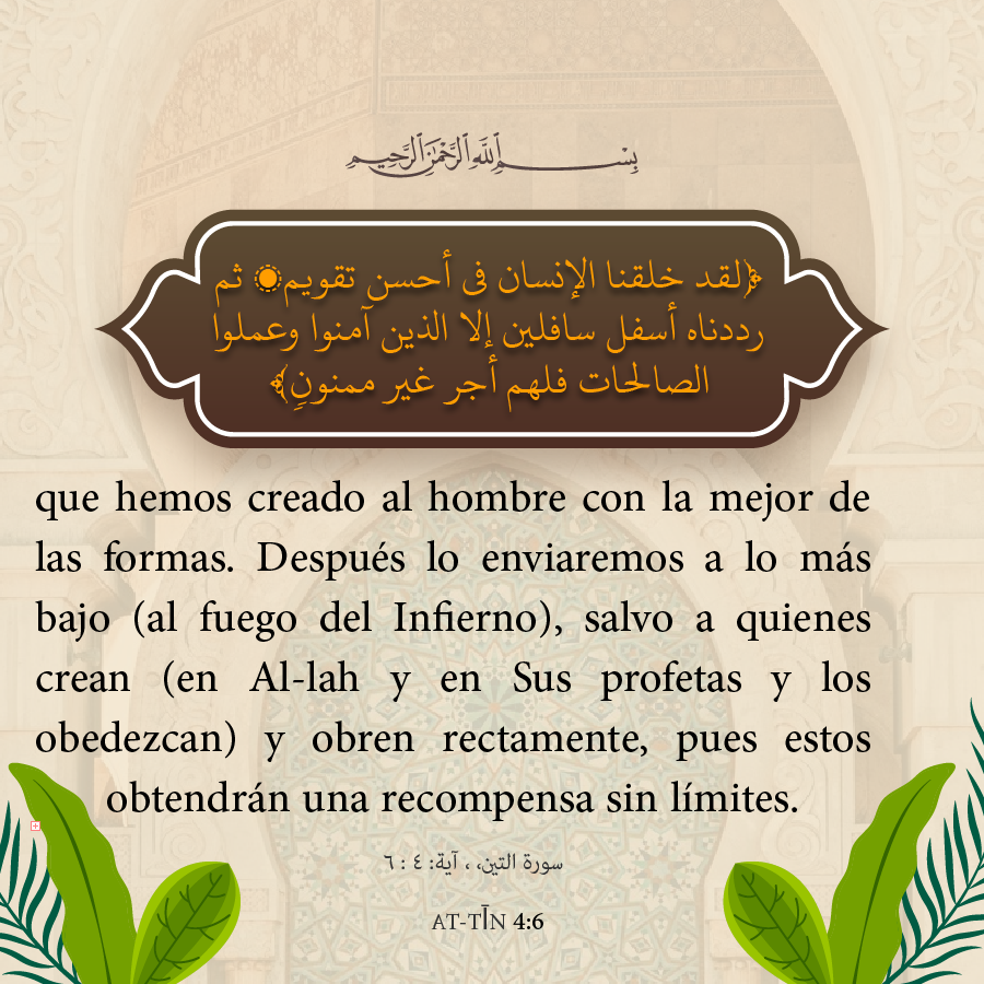 que hemos creado al hombre con la mejor de las formas.Después lo enviaremos a lo más bajo (al fuego del infierno),salvo a quienes crean (en Al-lah y en Sus profetas y los obedezcan) y obren rectamente, pues estos obtendrán una recompensa sin límites.