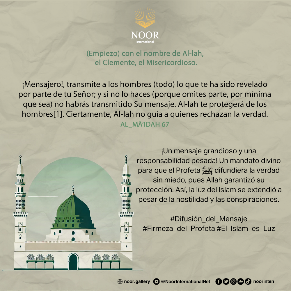 Un mensaje grandioso y una responsabilidad pesada! Un mandato divino para que el Profeta ﷺ difundiera la verdad sin miedo, pues Allah garantizó su protección. Así, la luz del Islam se extendió a pesar de la hostilidad y las conspiraciones. #Difusión_del_Mensaje #Firmeza_del_Profeta #El_Islam_es_Luz