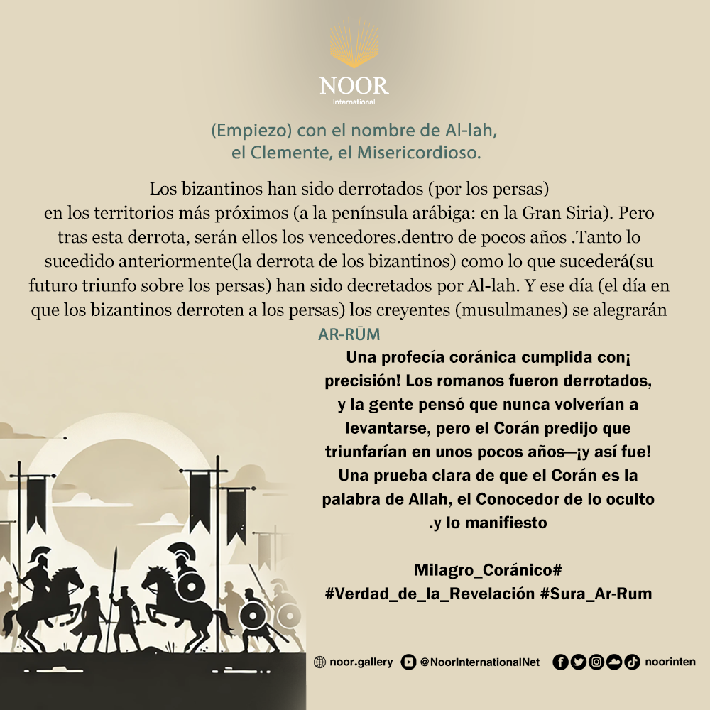 Una profecía coránica cumplida con precisión! Los romanos fueron derrotados, y la gente pensó que nunca volverían a levantarse, pero el Corán predijo que triunfarían en unos pocos años—¡y así fue! Una prueba clara de que el Corán es la palabra de Allah, el Conocedor de lo oculto y lo manifiesto. #Milagro_Coránico #Verdad_de_la_Revelación #Sura_Ar-Rum