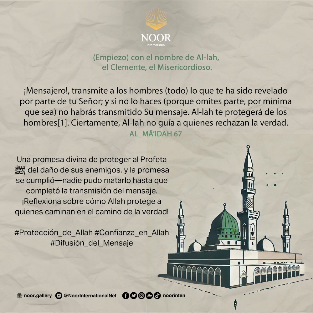Una promesa divina de proteger al Profeta ﷺ del daño de sus enemigos, y la promesa se cumplió—nadie pudo matarlo hasta que completó la transmisión del mensaje. ¡Reflexiona sobre cómo Allah protege a quienes caminan en el camino de la verdad! #Protección_de_Allah #Confianza_en_Allah #Difusión_del_Mensaje