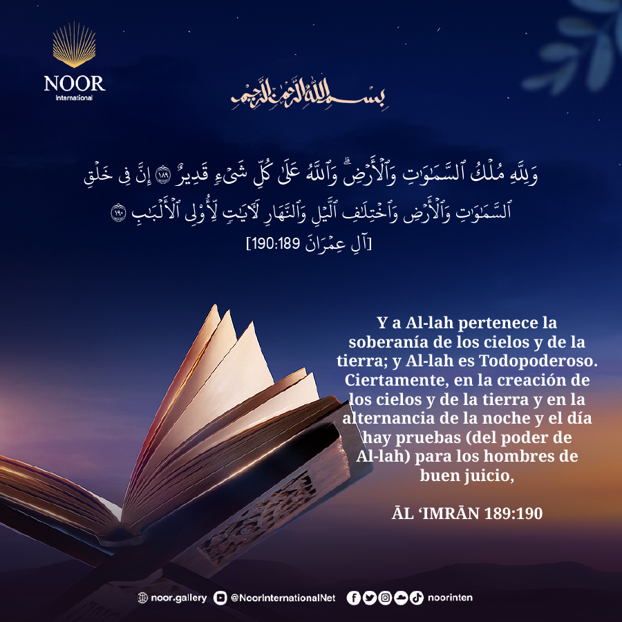 Ciertamente, en la creación de los cielos y de la tierra y en la alternancia de la noche y el día hay pruebas (del poder de Al-lah) para los hombres de buen juicio,