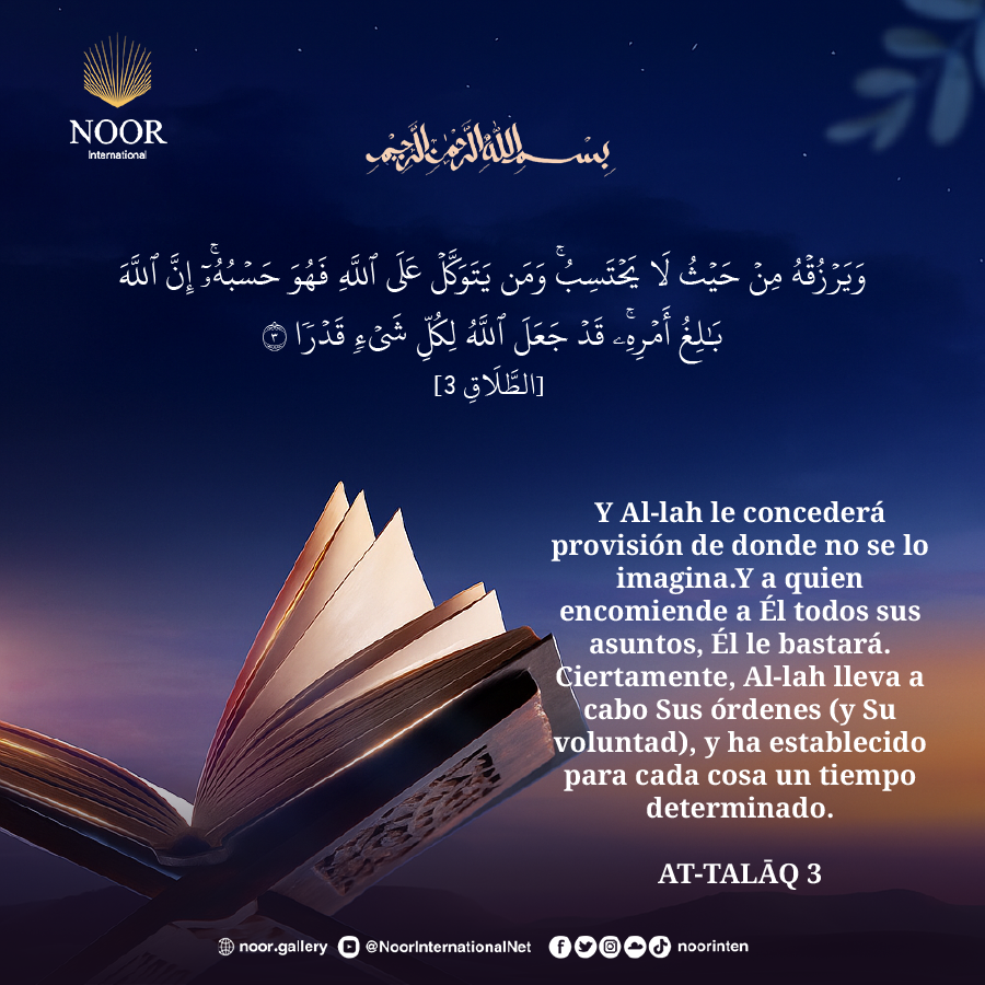 Y Al-lah le concederá provisión de donde no se lo imagina.Y a quien encomiende a Él todos sus asuntos, Él le bastará. Ciertamente, Al-lah lleva a cabo Sus órdenes (y Su voluntad), y ha establecido para cada cosa un tiempo determinado.