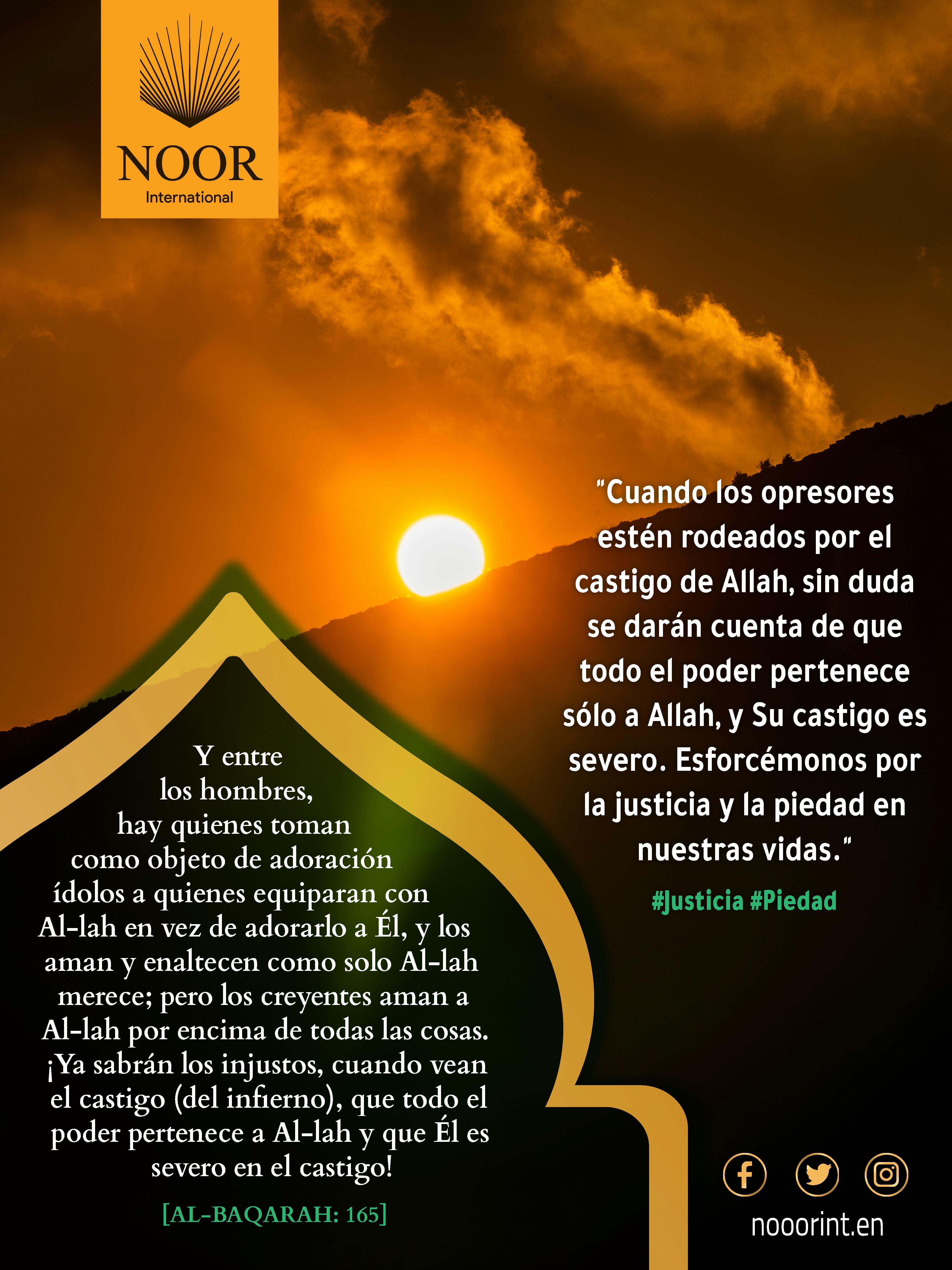 "Cuando los opresores estén rodeados por el castigo de Allah, sin duda se darán cuenta de que todo el poder pertenece sólo a Allah, y Su castigo es severo. Esforcémonos por la justicia y la piedad en nuestras vidas." #Justicia #Piedad