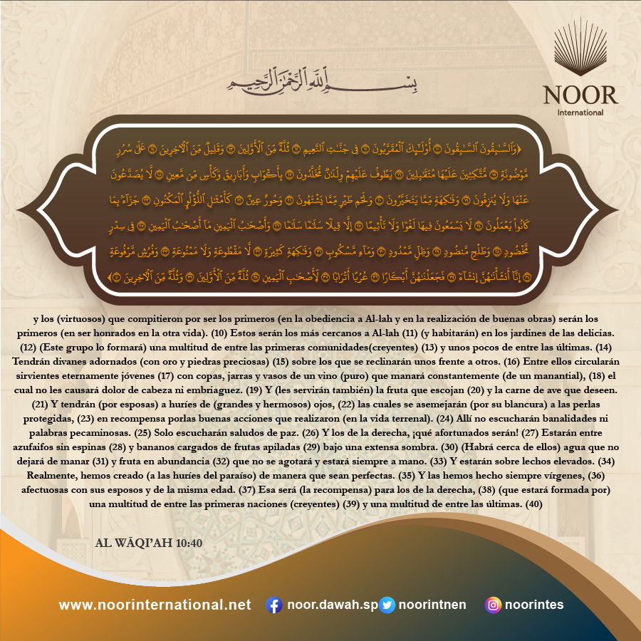 Y los primeros en creer, serán los primeros [en ser recompensados],(11). Ellos son los más cercanos [a Allah],(12). Estarán en jardines de delicias,(13). Un gran grupo de los primeros,(14). Y pocos de los últimos,(15). Reposando sobre divanes incrustados,(16). Reclinan unos frente a otros,(17). Les servirán jóvenes eternamente jóvenes,(18). Con copas, jarras y una bebida de manantial,(19). Que no les causará dolor de cabeza ni embriaguez,(20). Y frutas de su elección,(21). Y carne de ave de lo que deseen,(22). Y huríes de grandes ojos,(23). Como perlas bien guardadas,(24). En recompensa por lo que solían hacer.(25). No oirán en ella vanidades ni palabras pecaminosas,(26(. Solo se dirá: "¡Paz, paz!"(27). Y los compañeros de la derecha—¿quiénes son los compañeros de la derecha?(28). Estarán entre árboles de loto sin espinas,(29). Y plátanos en racimos,(30). Sombra extendida,(31). Agua que fluye continuamente,(32). Frutas abundantes,(33). Ni cortadas ni prohibidas,(34). Y lechos elevados,(35). En verdad, las hemos creado con una nueva creación,(36). Y las hicimos vírgenes,(37). Amantes y de igual edad,(38). Para los compañeros de la derecha,(39). Una multitud de los primeros,(40). Y una multitud de los últimos