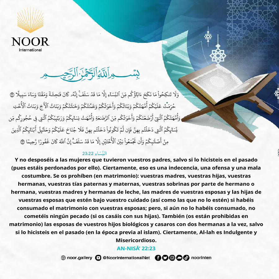 Se os prohíben (en matrimonio): vuestras madres, vuestras hijas, vuestras hermanas, vuestras tías paternas y maternas, vuestras sobrinas por parte de hermano o hermana, vuestras madres y hermanas de leche, las madres de vuestras esposas y las hijas de vuestras esposas que estén bajo vuestro cuidado (así como las que no lo estén) si habéis consumado el matrimonio con vuestras esposas; pero, si aún no lo habéis consumado, no cometéis ningún pecado (si os casáis con sus hijas). También (os están prohibidas en matrimonio) las esposas de vuestros hijos biológicos y casaros con dos hermanas a la vez, salvo si lo hicisteis en el pasado (en la época previa al islam). Ciertamente, Al-lah es Indulgente y Misericordioso.