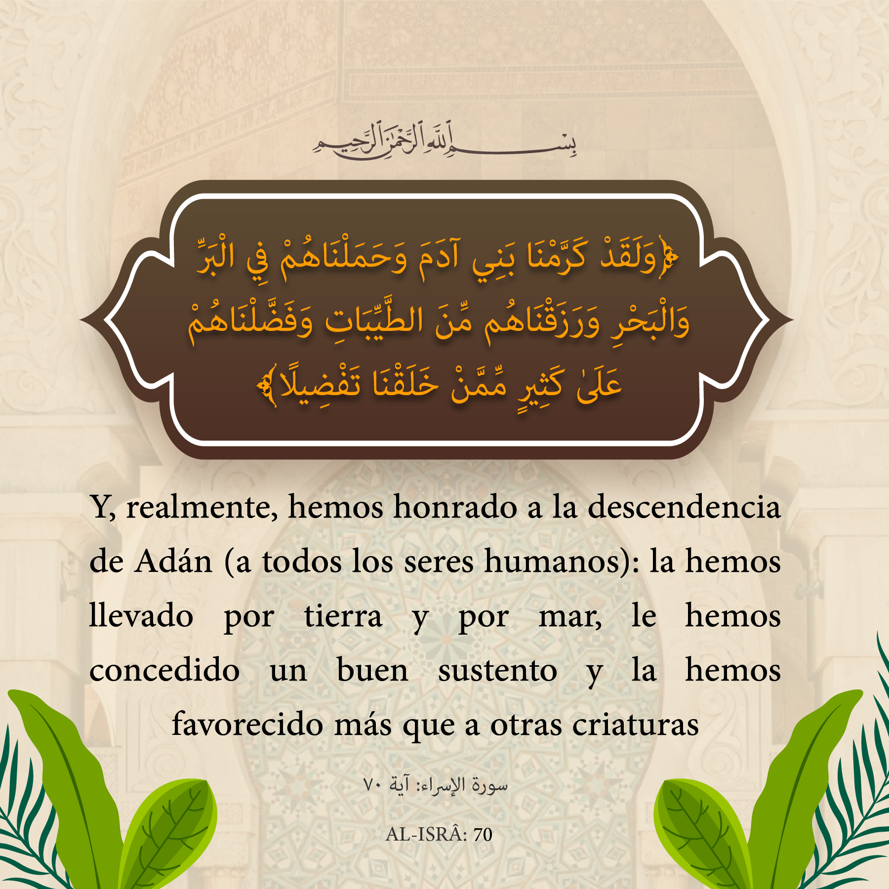 Y, realmente, hemos honrado a la descendencia de Adán (a todos los seres humanos): la hemos llevado por tierra y por mar, le hemos concedido un buen sustento y la hemos favorecido más que a otras criaturas.