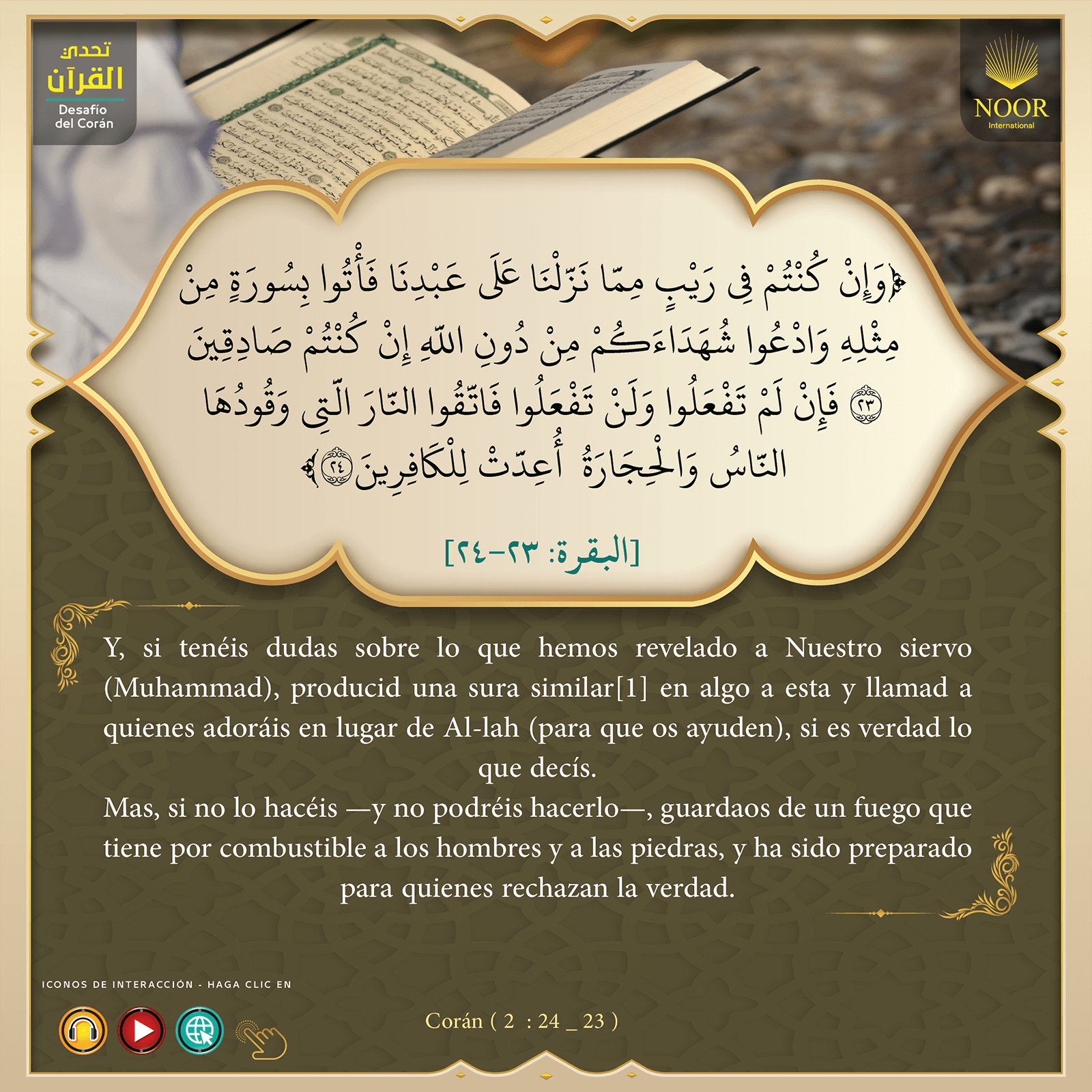Y, si tenéis dudas sobre lo que hemos revelado a Nuestro siervo (Muhammad), producid una sura similar[1] en algo a esta y llamad a quienes adoráis en lugar de Al-lah (para que os ayuden), si es verdad lo que decís. Mas, si no lo hacéis —y no podréis hacerlo—, guardaos de un fuego que tiene por combustible a los hombres y a las piedras, y ha sido preparado para quienes rechazan la verdad.