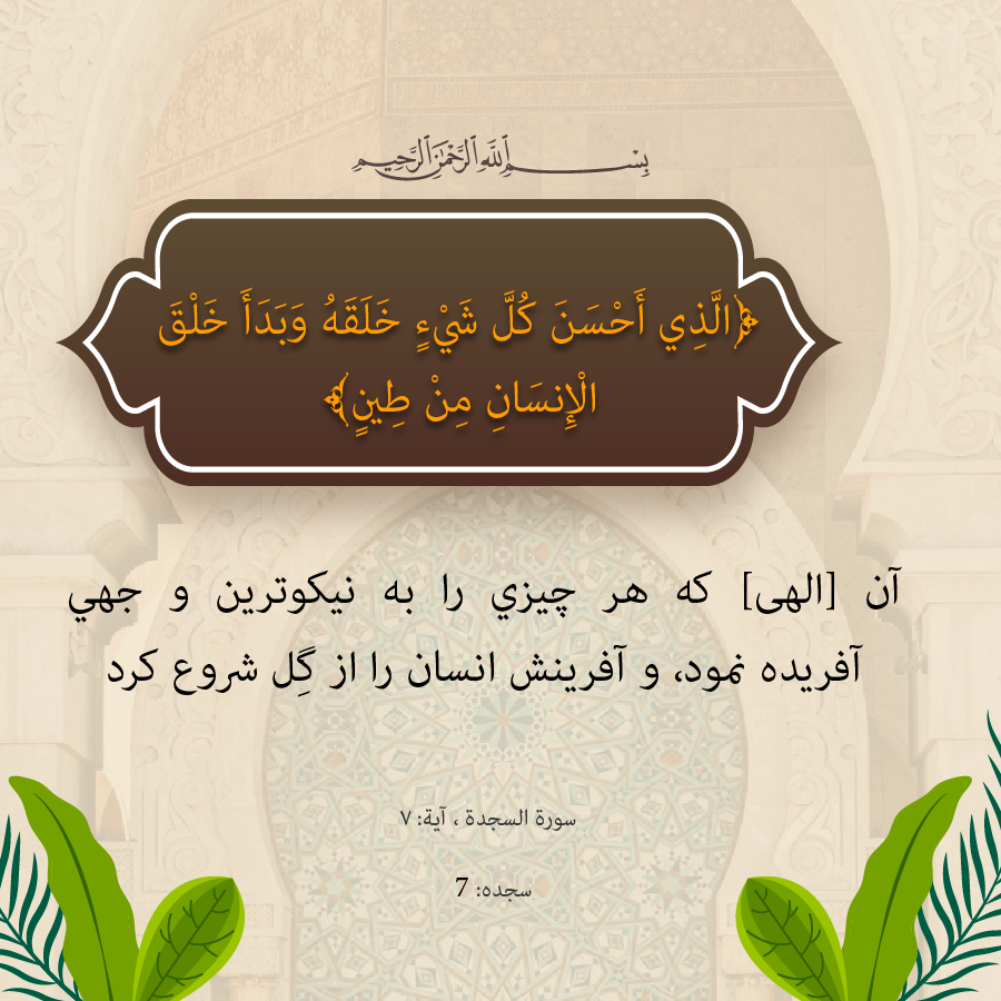 آن [الهى] كه هر چيزي را به نيكوترين و جهي آفريده نمود، و آفرينش انسان را از گِل شروع كرد