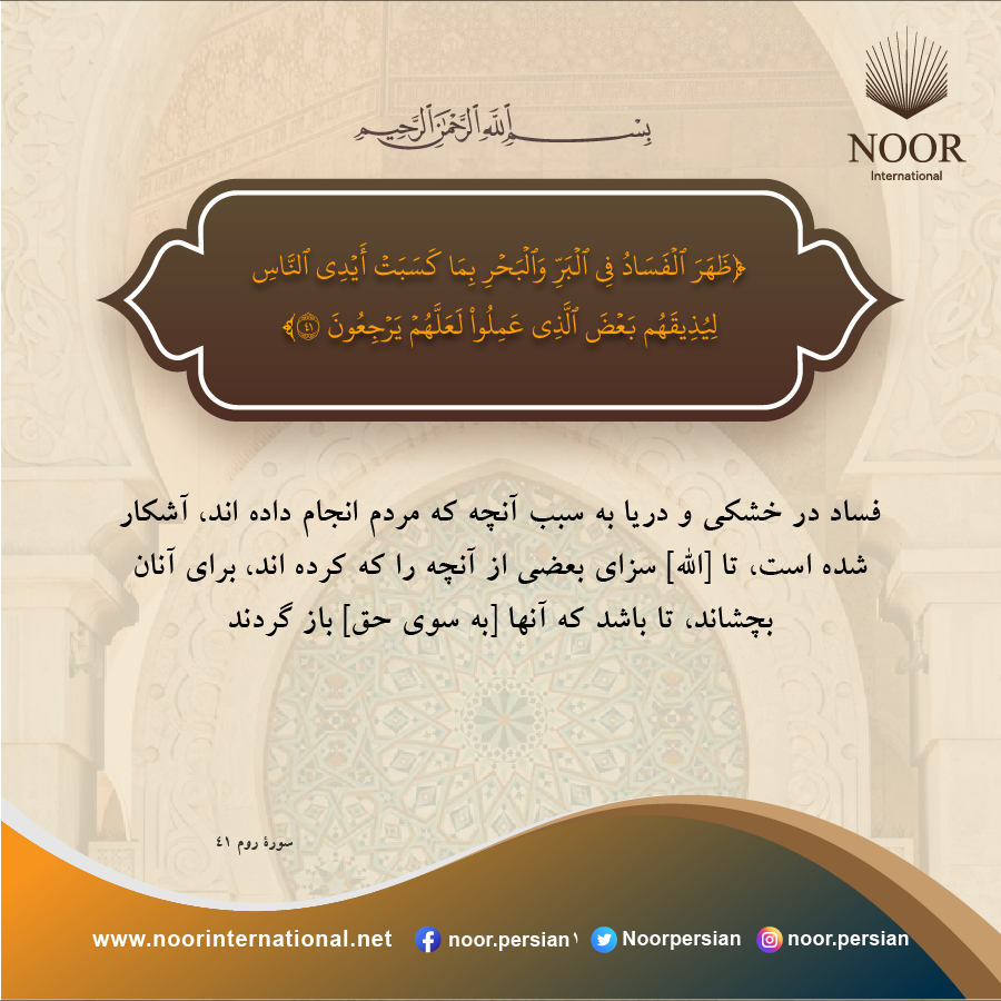 فساد در خشكي و دريا به سبب آنچه كه مردم انجام داده اند، آشكار شده است، تا [الله] سزاي بعضي از آنچه را كه كرده اند، براي آنان بچشاند، تا باشد كه آنها [به سوي حق] باز گردند