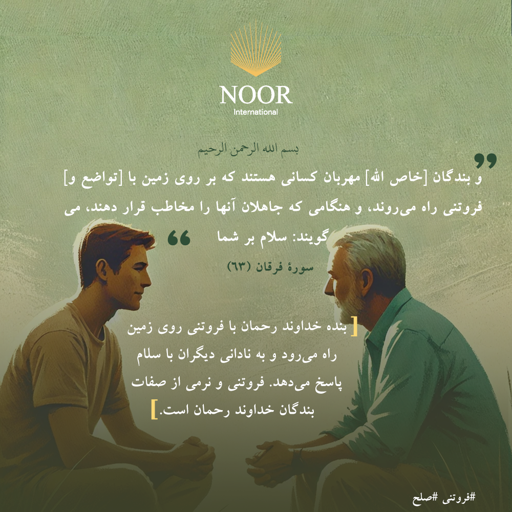 بنده خداوند رحمان با فروتنی روی زمین راه می‌رود و به نادانی دیگران با سلام پاسخ می‌دهد. فروتنی و نرمی از صفات بندگان خداوند رحمان است. #فروتنی #صلح