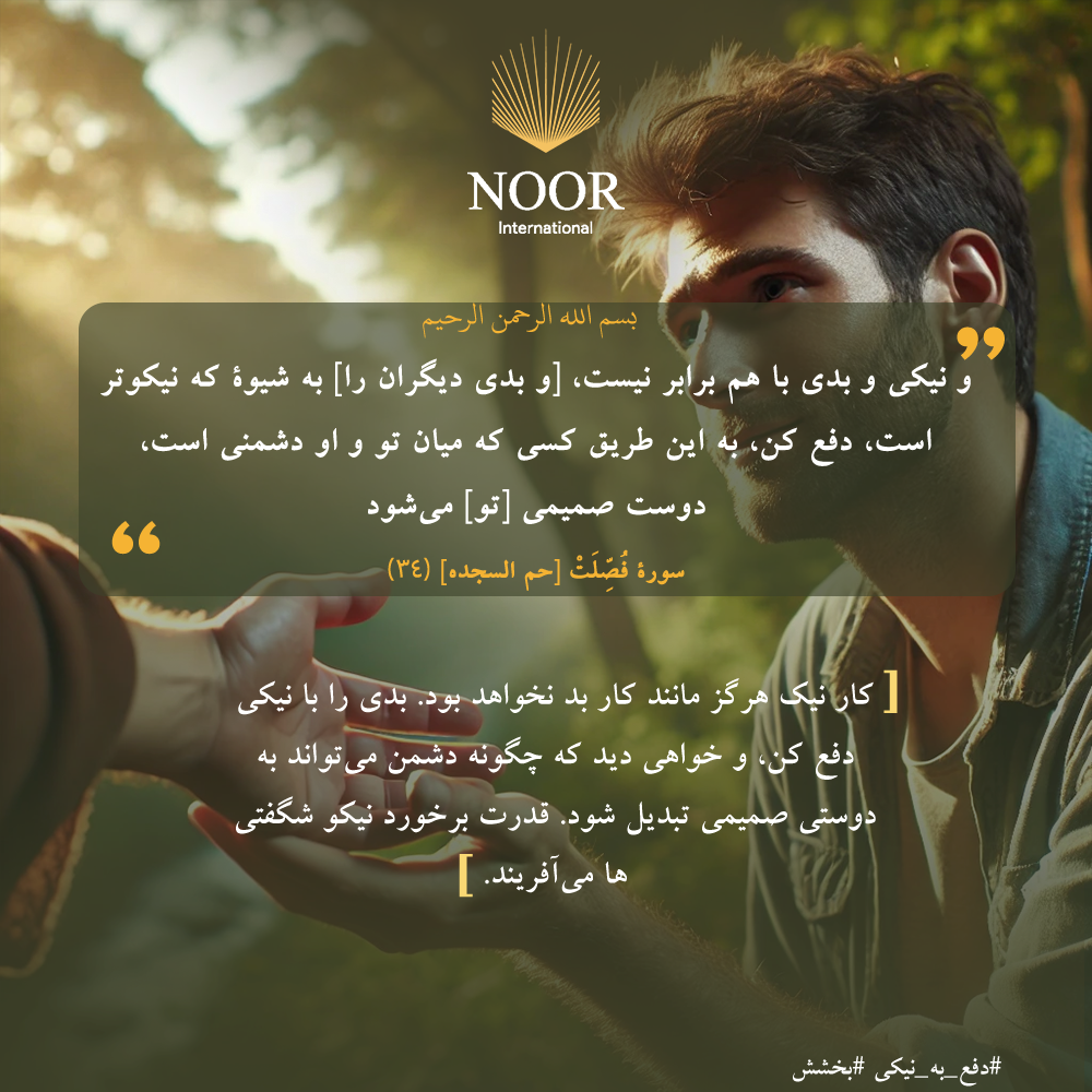 کار نیک هرگز مانند کار بد نخواهد بود. بدی را با نیکی دفع کن، و خواهی دید که چگونه دشمن میتواند به دوستی صمیمی تبدیل شود. قدرت برخورد نیکو شگفتیها میآفریند. #دفع_به_نیکی #بخشش