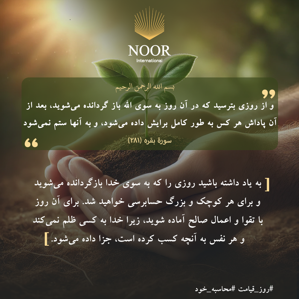 به یاد داشته باشید روزی را که به سوی خدا بازگردانده می‌شوید و برای هر کوچک و بزرگ حسابرسی خواهید شد. برای آن روز با تقوا و اعمال صالح آماده شوید، زیرا خدا به کسی ظلم نمی‌کند و هر نفس به آنچه کسب کرده است، جزا داده می‌شود. #روز_قیامت #محاسبه_خود
