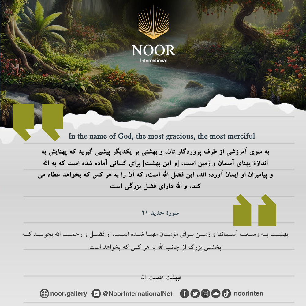 «بهشت به وسعت آسمانها و زمین برای مؤمنان مهیا شده است، از فضل و رحمت الله بجویید که بخشش بزرگ از جانب الله به هر کس که بخواهد است». #بهشت #نعمت_الله