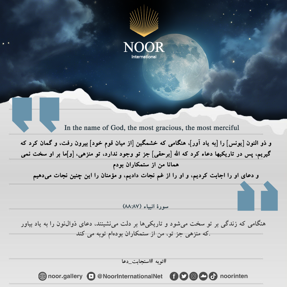 «هنگامی که زندگی بر تو سخت میشود و تاریکیها بر دلت مینشینند، دعای ذوالنون را به یاد بیاور که منزهی جز تو، من از ستمکاران بودهام توبه می کند.» #توبه #استجابت_دعا