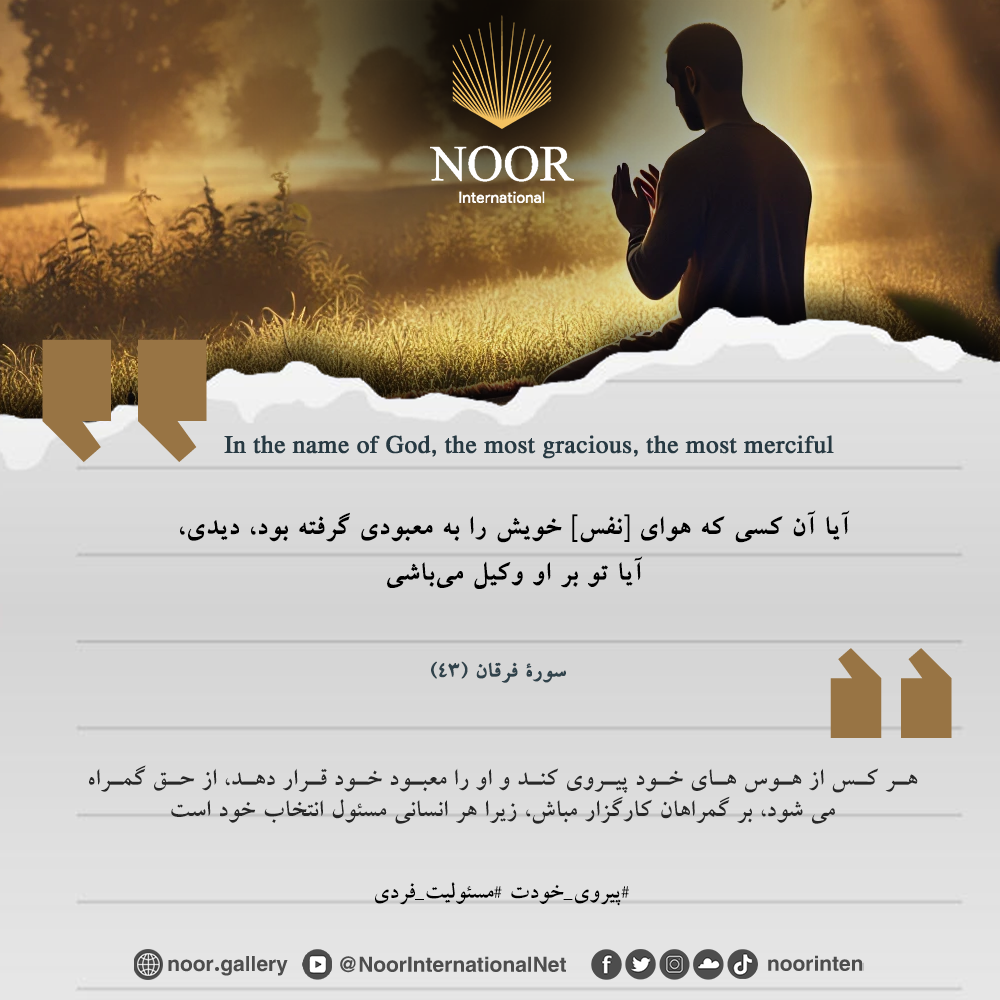 «هر کس از هوس های خود پیروی کند و او را معبود خود قرار دهد، از حق گمراه می شود، بر گمراهان کارگزار مباش، زیرا هر انسانی مسئول انتخاب خود است». #پیروی_خودت #مسئولیت_فردی