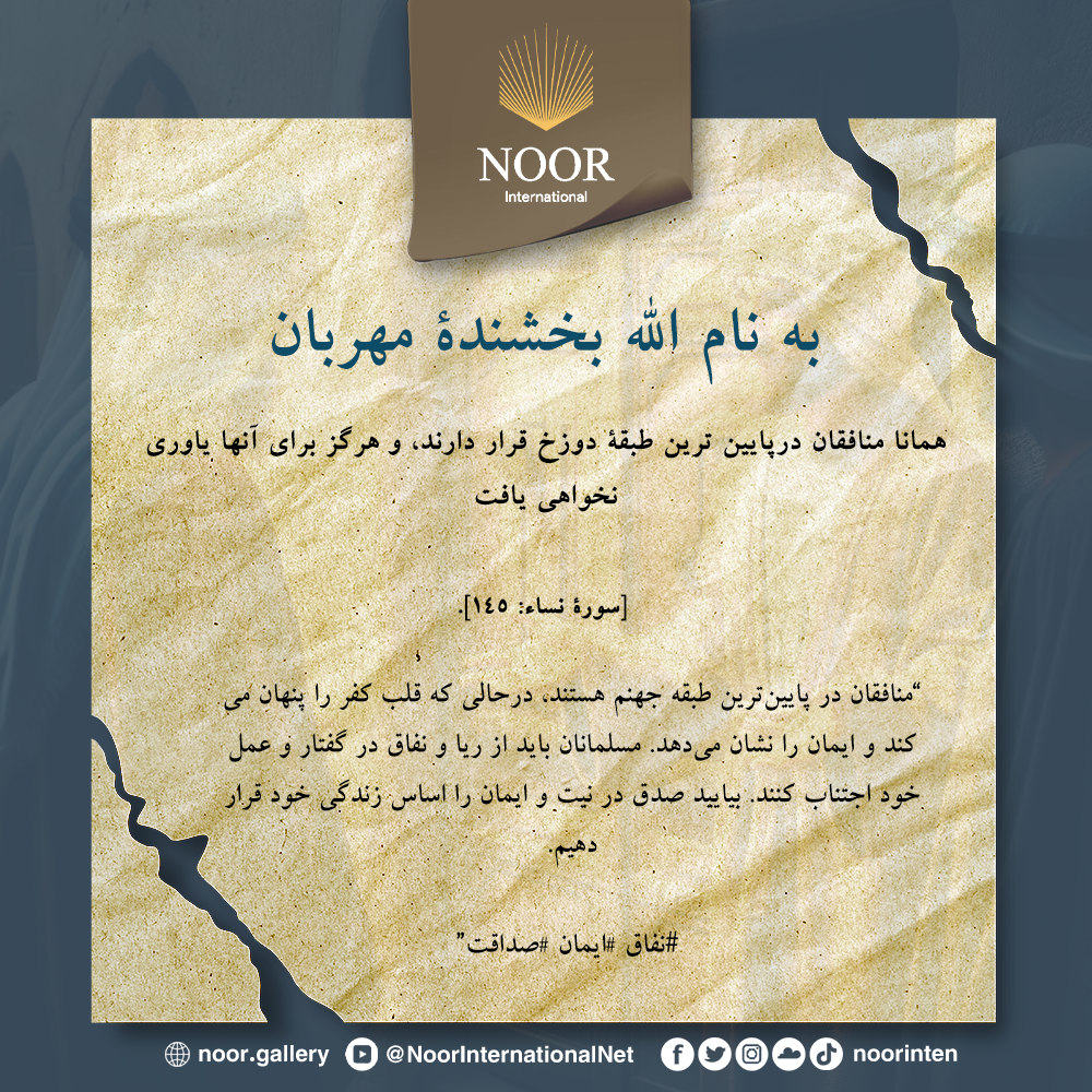 "منافقان در پایین‌ترین طبقه جهنم هستند، درحالى که قلب کفر را پنهان می‌کند و ایمان را نشان می‌دهد. مسلمانان باید از ریا و نفاق در گفتار و عمل خود اجتناب کنند. بیایید صدق در نیت و ایمان را اساس زندگی خود قرار دهیم. #نفاق #ایمان #صداقت"