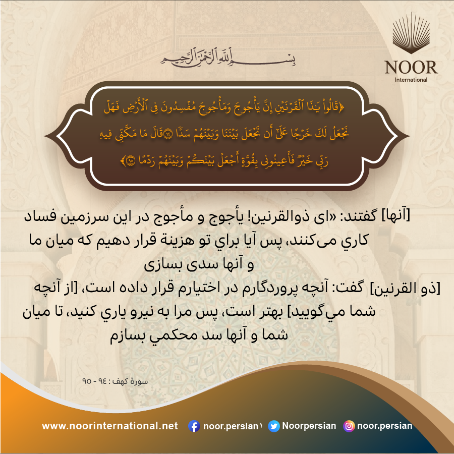 [آنها] گفتند: «ای ذوالقرنين! يأجوج و مأجوج در اين سرزمين فساد كاري میکنند، پس آيا براي تو هزينة قرار دهيم كه ميان ما و آنها سدی بسازی [ذو القرنين] گفت: آنچه پروردگارم در اختيارم قرار داده است، [از آنچه شما ميگوييد] بهتر است، پس مرا به نيرو ياري كنيد، تا ميان شما و آنها سد محكمي بسازمAL‑KAHF: 94-95