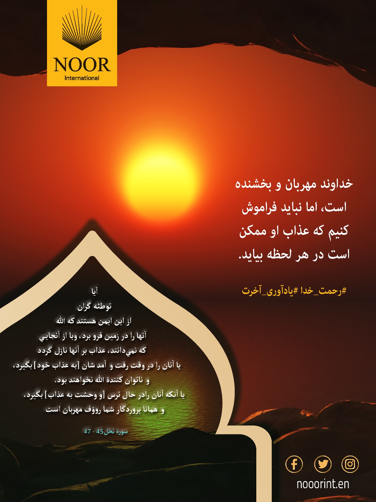 خداوند مهربان و بخشنده است، اما نباید فراموش کنیم که عذاب او ممکن است در هر لحظه بیاید. #رحمت_خدا #یادآوری_آخرت
