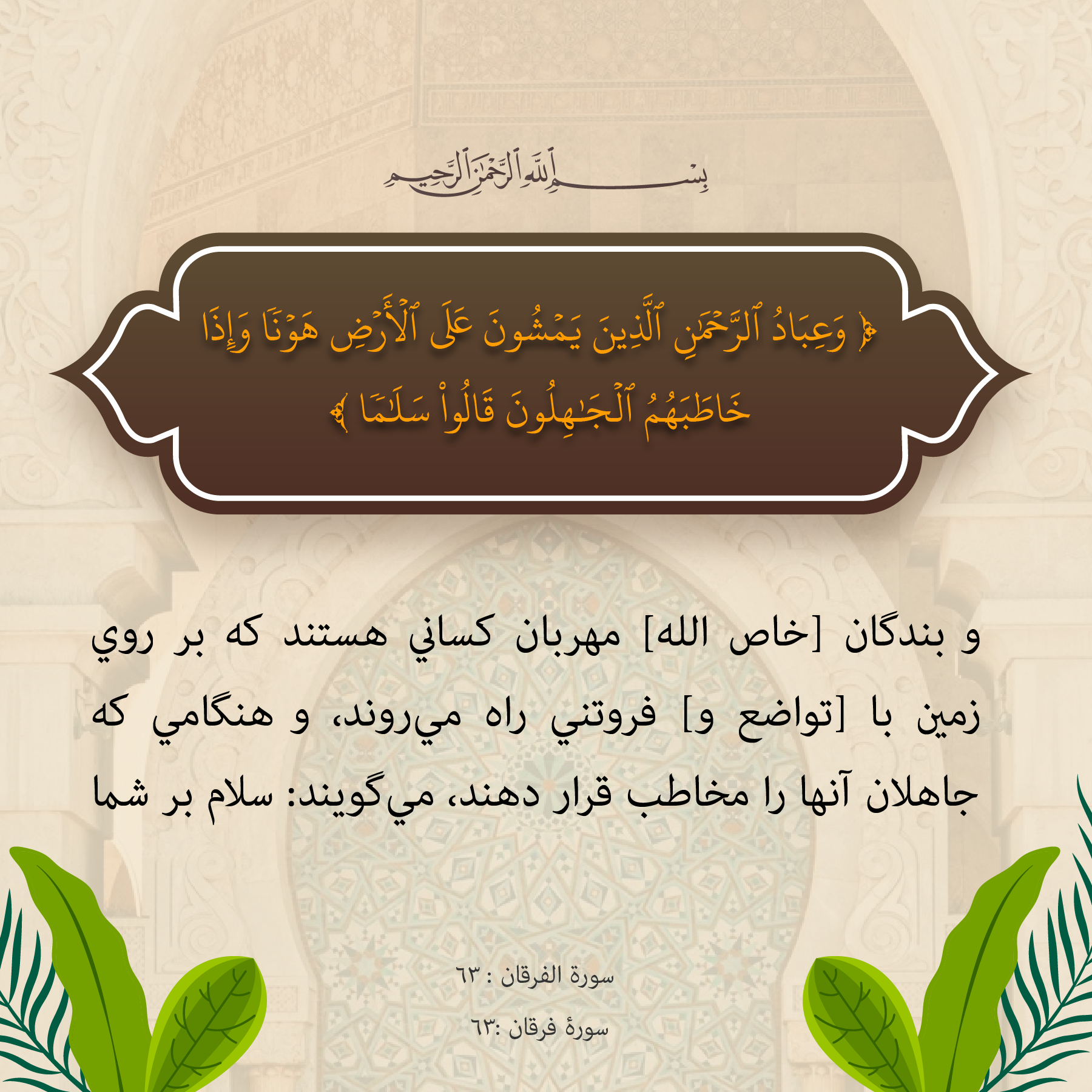 و بندگان [خاص الله] مهربان كساني هستند كه بر روي زمين با [تواضع و] فروتني راه ميروند، و هنگامي كه جاهلان آنها را مخاطب قرار دهند، ميگويند: سلام بر شما