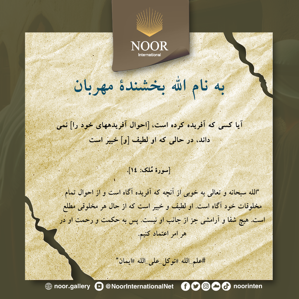 "الله سبحانه و تعالی به‌ خوبی از آنچه که آفریده آگاه است و از احوال تمام مخلوقات خود آگاه است. او لطیف و خبیر است که از حال هر مخلوقی مطلع است. هیچ شفا و آرامشی جز از جانب او نیست. پس به حکمت و رحمت او در هر امر اعتماد کنیم. #علم_الله #توکل_علی_الله #ایمان"