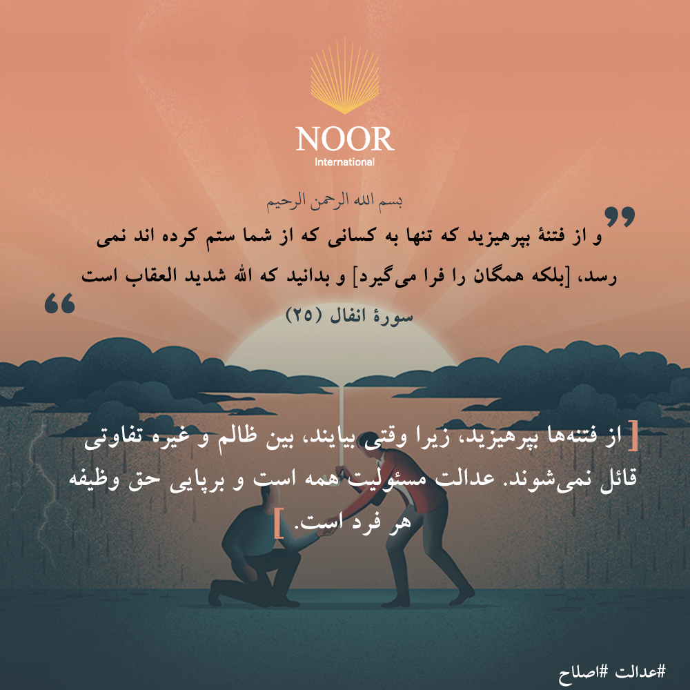 از فتنهها بپرهیزید، زیرا وقتی بیایند، بین ظالم و غیره تفاوتی قائل نمیشوند. عدالت مسئولیت همه است و برپایی حق وظیفه هر فرد است. #عدالت #اصلاح