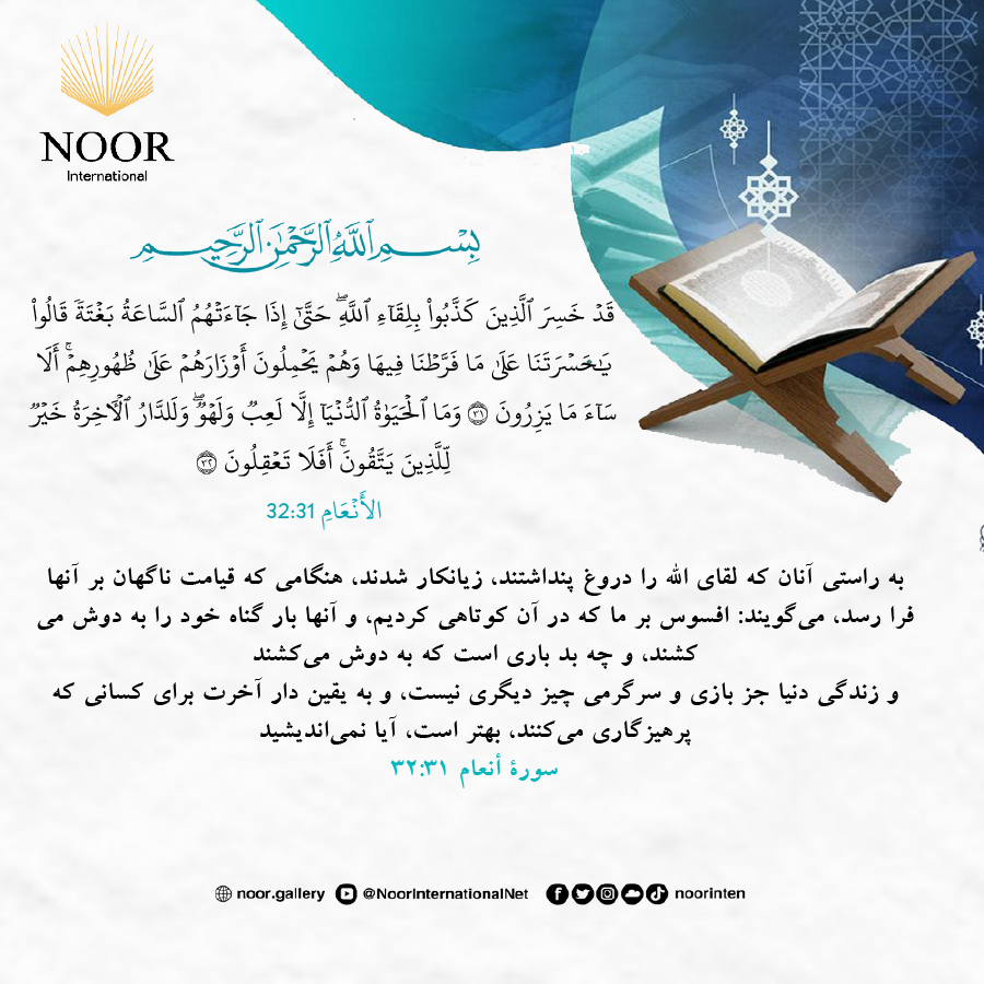 به راستي آنان كه لقاي الله را دروغ پنداشتند، زيانكار شدند، هنگامي كه قيامت ناگهان بر آنها فرا رسد، ميگويند: افسوس بر ما كه در آن كوتاهي كرديم، و آنها بار گناه خود را به دوش ميكشند، و چه بد باري است كه به دوش ميكشند