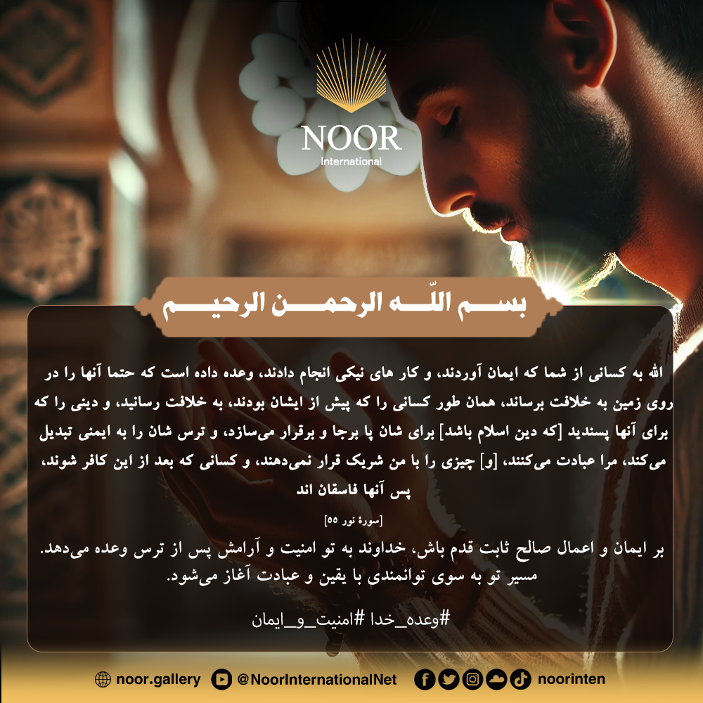 بر ایمان و اعمال صالح ثابت قدم باش، خداوند به تو امنیت و آرامش پس از ترس وعده میدهد. مسیر تو به سوی توانمندی با یقین و عبادت آغاز میشود. #وعده_خدا #امنیت_و_ایمان