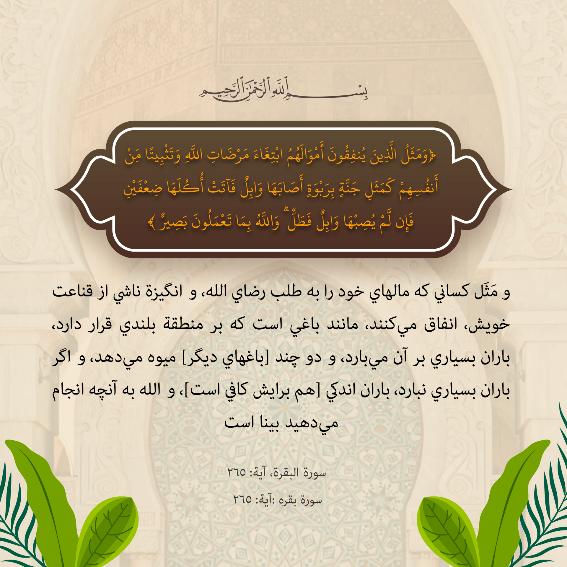 و مَثَل كساني كه مالهاي خود را به طلب رضاي الله، و انگيزة ناشي از قناعت خويش، انفاق مي‌كنند، مانند باغي است كه بر منطقة بلندي قرار دارد، باران بسياري بر آن مي‌بارد، و دو چند [باغهاي ديگر] ميوه مي‌دهد، و اگر باران بسياري نبارد، باران اندكي [هم برايش كافي است]، و الله به آنچه انجام مي‌دهيد بينا است