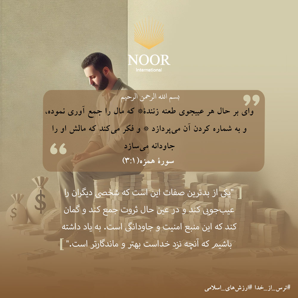 یکی از بدترین صفات این است که شخصی دیگران را عیب‌جویی کند و در عین حال ثروت جمع کند و گمان کند که این منبع امنیت و جاودانگی است. به یاد داشته باشیم که آنچه نزد خداست بهتر و ماندگارتر است."
