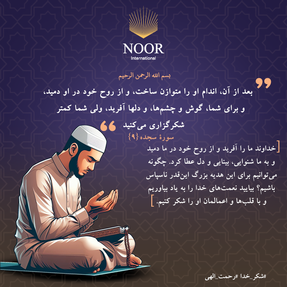 خداوند ما را آفرید و از روح خود در ما دمید و به ما شنوایی، بینایی و دل عطا کرد. چگونه می‌توانیم برای این هدیه بزرگ این‌قدر ناسپاس باشیم؟ بیایید نعمت‌های خدا را به یاد بیاوریم و با قلب‌ها و اعمالمان او را شکر کنیم. #شکر_خدا #رحمت_الهی