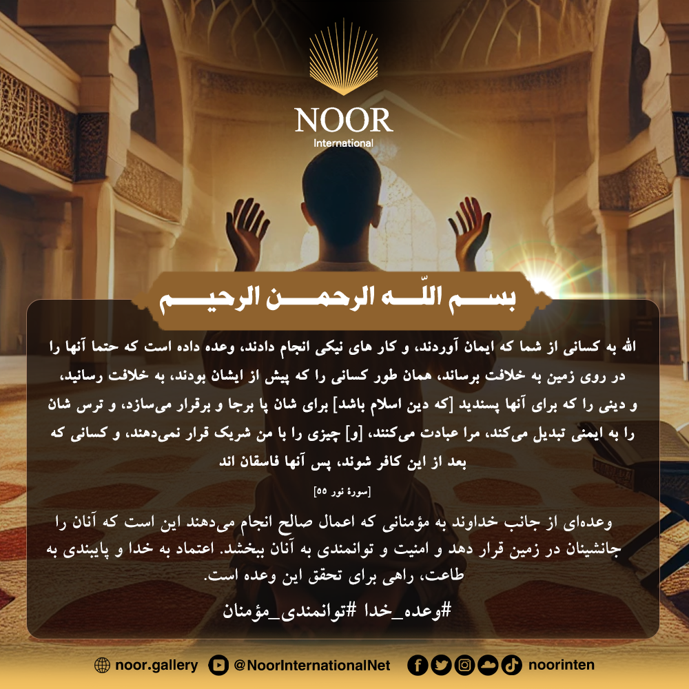 وعده‌ای از جانب خداوند به مؤمنانی که اعمال صالح انجام می‌دهند این است که آنان را جانشینان در زمین قرار دهد و امنیت و توانمندی به آنان ببخشد. اعتماد به خدا و پایبندی به طاعت، راهی برای تحقق این وعده است. #وعده_خدا #توانمندی_مؤمنان