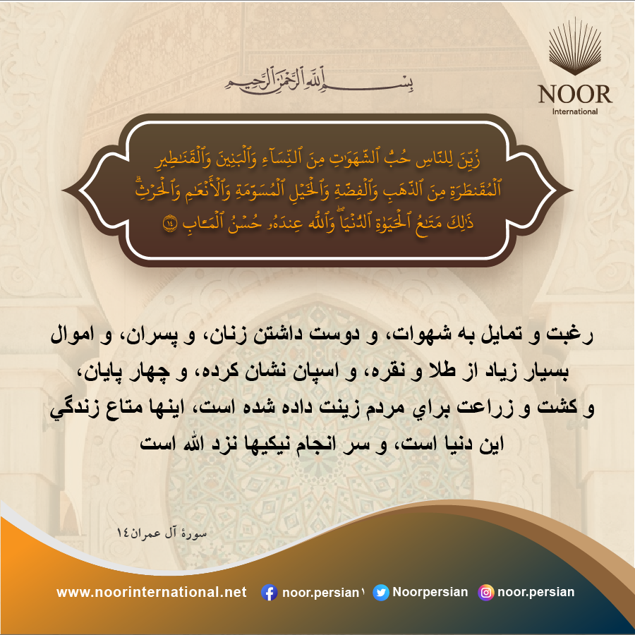 رغبت و تمايل به شهوات، و دوست داشتن زنان، و پسران، و اموال بسيار زياد از طلا و نقره، و اسپان نشان كرده، و چهار پايان، و كشت و زراعت براي مردم زينت داده شده است، اينها متاع زندگي اين دنيا است، و سر انجام نيكيها نزد الله است