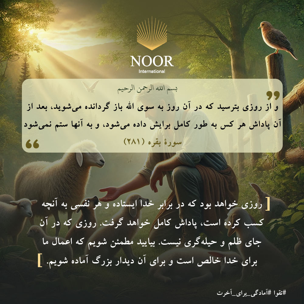 • روزی خواهد بود که در برابر خدا ایستاده و هر نفسی به آنچه کسب کرده است، پاداش کامل خواهد گرفت. روزی که در آن جای ظلم و حیله‌گری نیست. بیایید مطمئن شویم که اعمال ما برای خدا خالص است و برای آن دیدار بزرگ آماده شویم. #تقوا #آمادگی_برای_آخرت