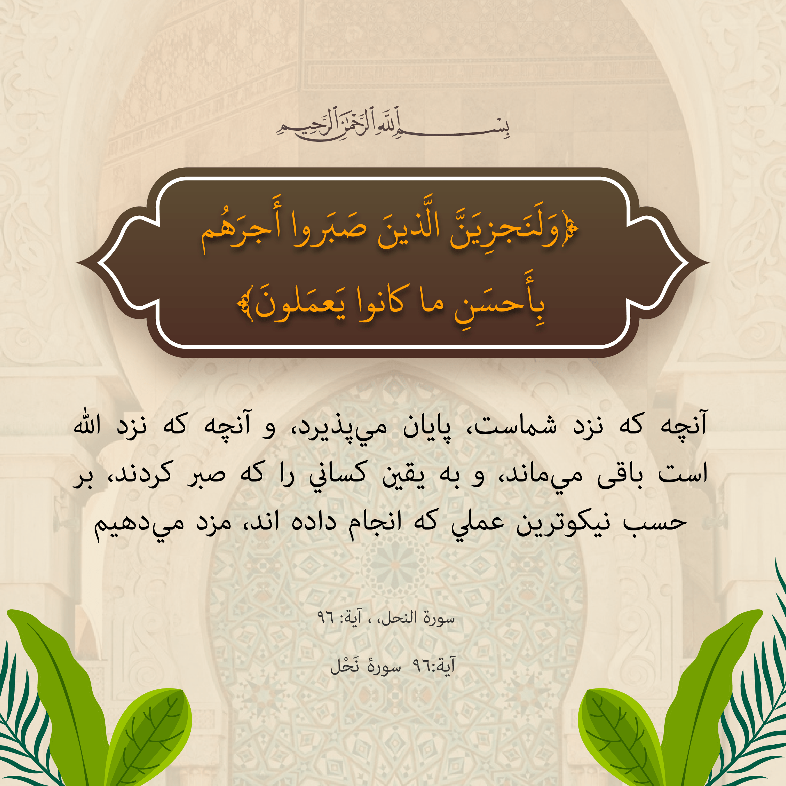 آنچه كه نزد شماست، پايان ميپذيرد، و آنچه كه نزد الله است باقی ميماند، و به يقين كساني را كه صبر كردند، بر حسب نيكوترين عملي كه انجام داده اند، مزد ميدهيم